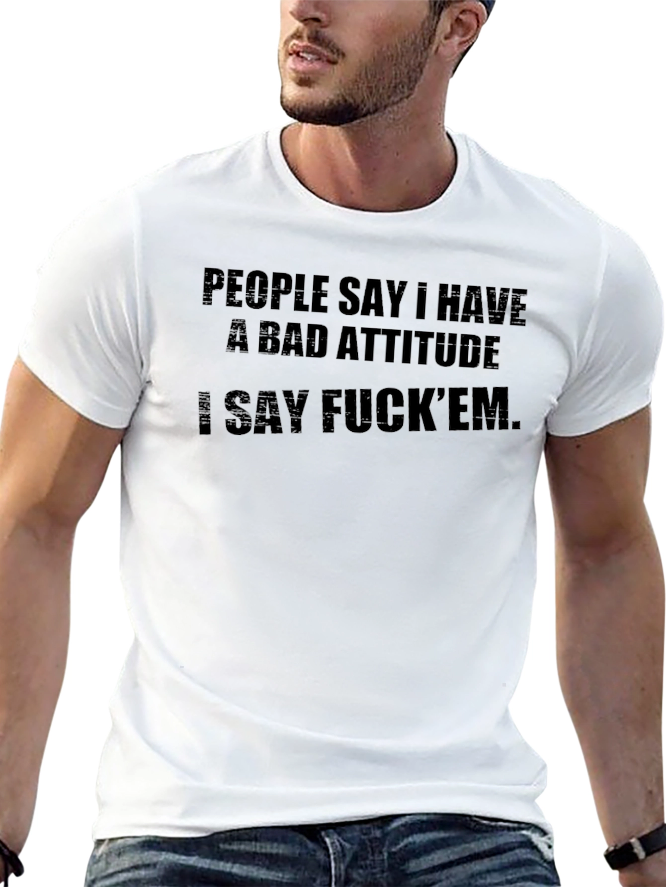 Show off your bold side with this edgy black graphic tee. Made from a soft, breathable fabric, this t-shirt features a crew neckline and a comfortable fit for all-day wear. The standout design showcases the phrase "PEOPLE SAY I HAVE A BAD ATTITUDE, I SAY FUCK'EM" in a striking, distressed font. Perfect for casual outings, concerts, or expressing your unique personality, this tee is sure to make a statement. Pair it with jeans, shorts, or layer it under a jacket for a versatile, rebellious look. Embrace your individuality and let your style do the talking with this standout piece.