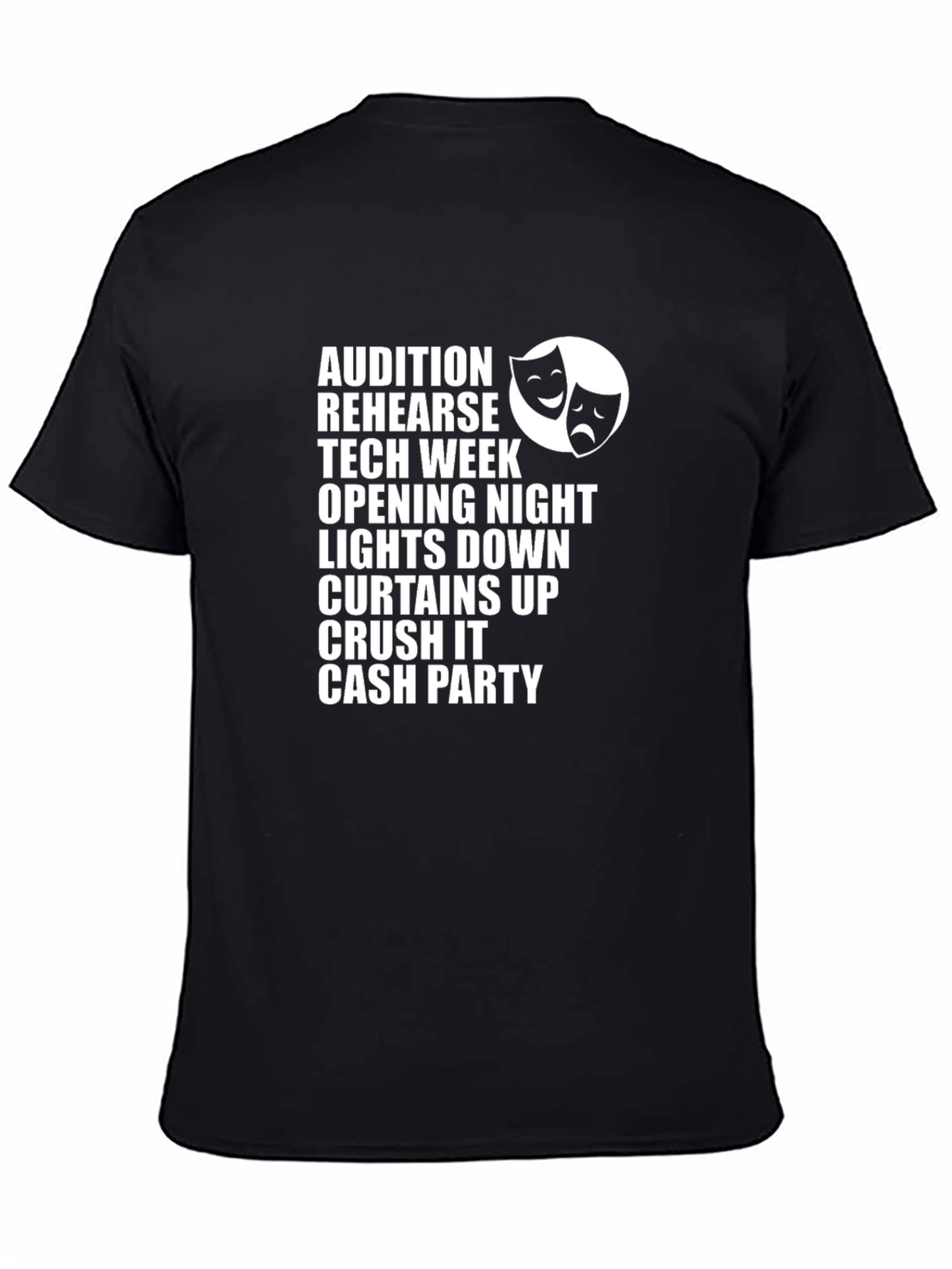 This classic black t-shirt is perfect for anyone involved in theater! The shirt features a bold, white text design listing the stages of a production: "Audition, Rehearse, Tech Week, Opening Night, Lights Down, Curtains Up, Crush It, Cash Party." A playful theater mask graphic accompanies the list, adding a touch of theatrical flair. Made from a comfortable-looking cotton blend, this tee is ideal for casual wear, rehearsals, or cast parties. Show off your passion for the stage with this stylish and unique t-shirt!