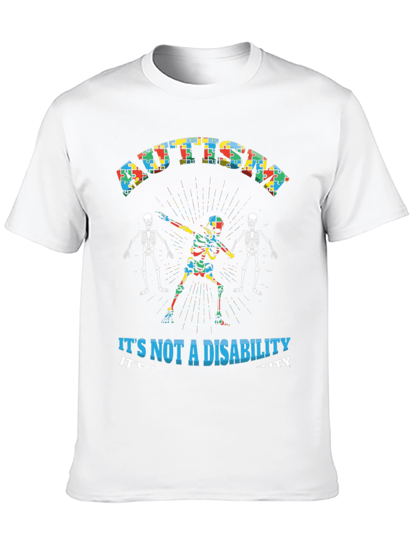 Show your support with this unique Autism Acceptance t-shirt. Featuring a skeleton dabbing design adorned with puzzle pieces, the shirt highlights 'AUTISM' in a puzzle-piece font and the phrase 'IT'S NOT A DISABILITY, IT'S A DIFFERENT ABILITY'. Two additional skeleton figures in the background complete the striking design. Made from a comfortable black fabric, this tee is ideal for raising awareness and promoting understanding. Wear it to support autism awareness events or as a daily statement of acceptance and inclusivity. A bold and meaningful way to express your support.