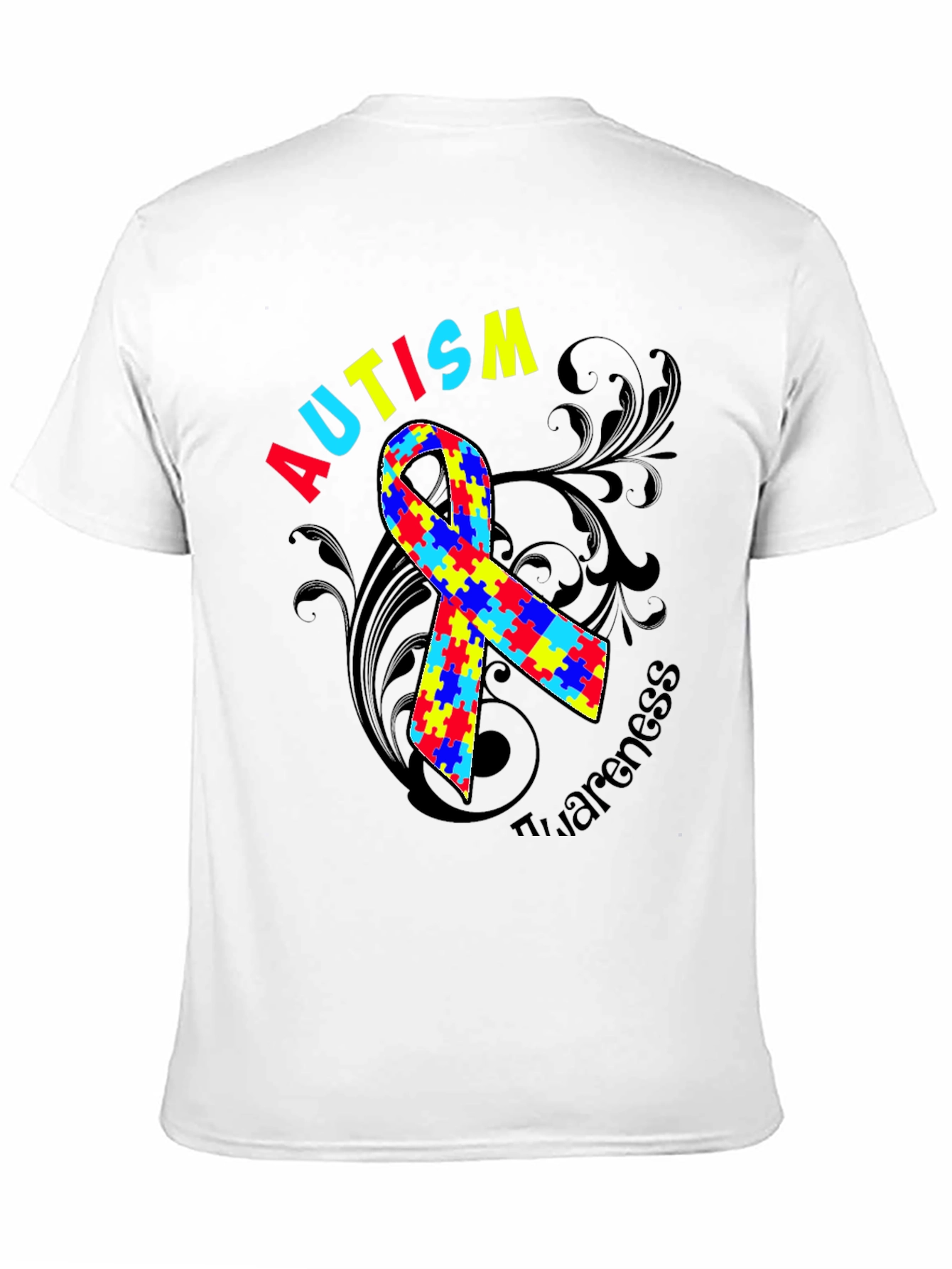 Show your support with this Autism Awareness T-shirt. The design features a vibrant puzzle piece ribbon, a symbol of autism awareness. The word 'AUTISM' is spelled out in bright, bold colors above the ribbon, set against a solid black background. Made from comfortable material, it's perfect for everyday wear, autism awareness events, or as a thoughtful gift to show support for loved ones. Stand out and make a statement with this eye-catching and meaningful tee shirt.