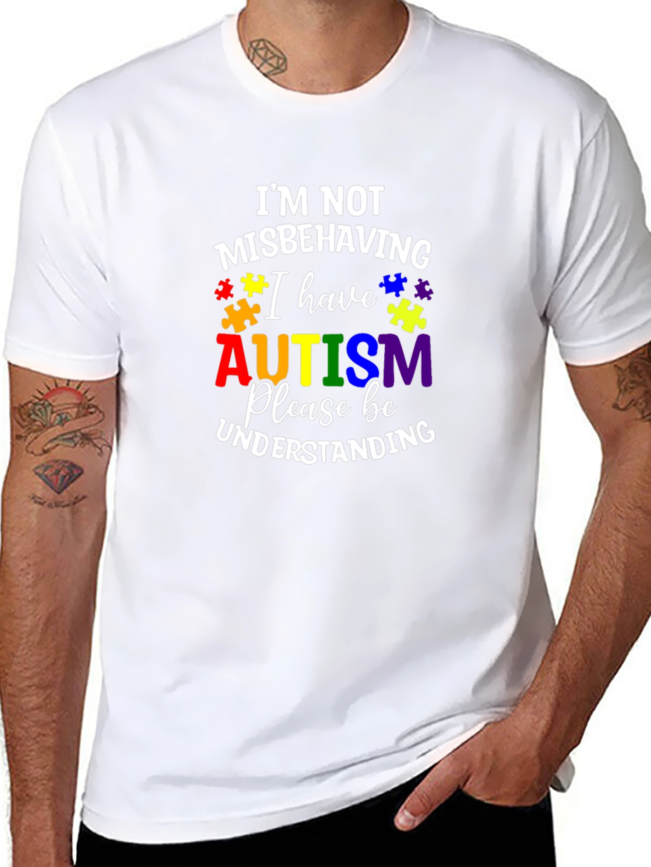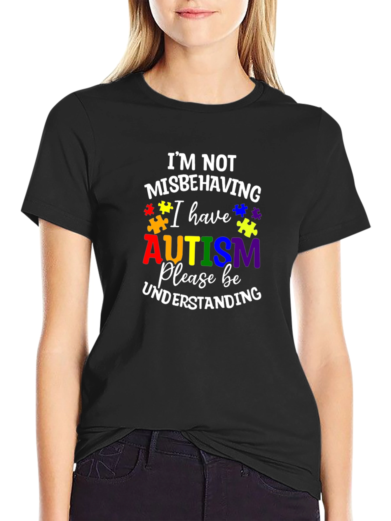 Show your support with this black Autism Awareness T-Shirt. Featuring the phrase "I'm Not Misbehaving I Have Autism Please Be Understanding" in vibrant, colorful text accented with puzzle piece graphics. This eye-catching design promotes understanding and acceptance. Made from a comfortable-looking fabric, this tee is perfect for everyday wear, autism awareness events, or as a conversation starter. Advocate for inclusivity in style with this meaningful garment.