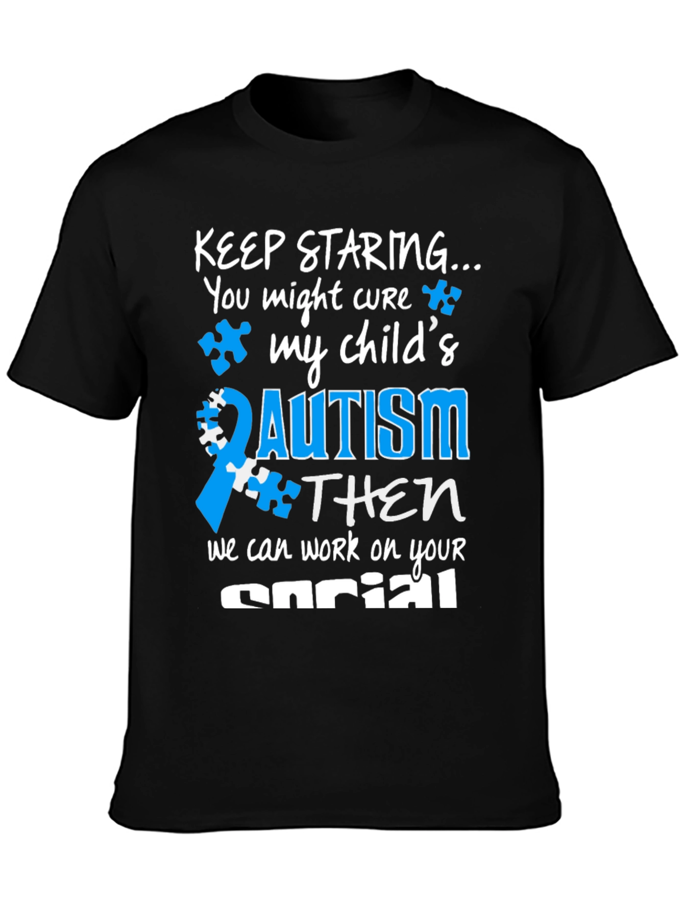 Show your support and spread awareness with this impactful Autism Awareness T-Shirt. The shirt features a bold statement: "KEEP STARING... You might cure my child's AUTISM THEN we can work on your social." Emblazoned on a black t-shirt, the design incorporates blue puzzle pieces and a ribbon, symbols associated with autism awareness. Made from comfortable material, this tee is perfect for everyday wear. Wear it to support a loved one, raise awareness, or simply express your belief in understanding and acceptance. A great conversation starter, this T-shirt combines fashion with a meaningful message.