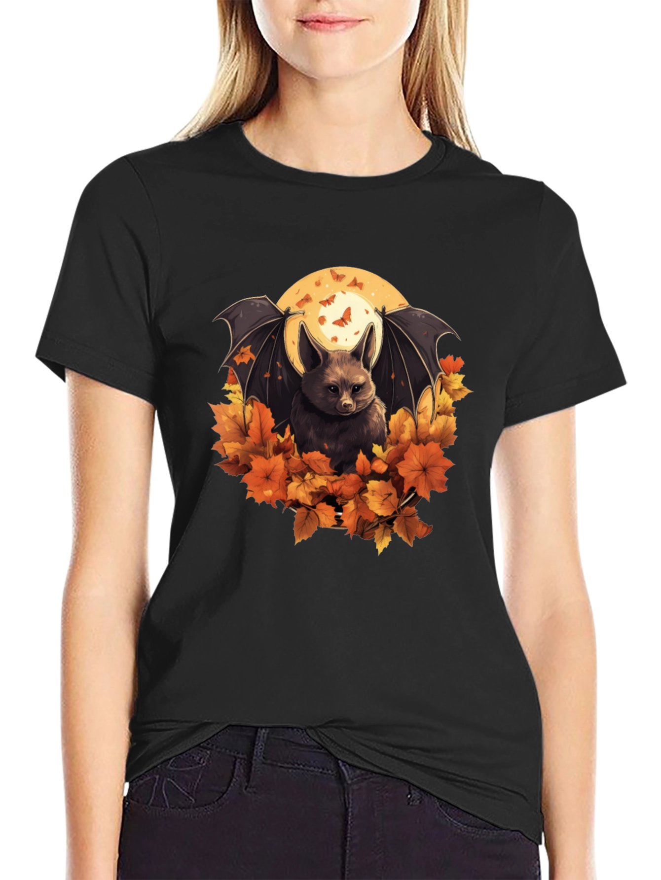 Embrace the spirit of spooky season with this unique graphic tee! This black t-shirt features a striking design of a cute bat set against an orange moon backdrop, surrounded by vibrant autumn leaves. The detailed illustration and rich colors make this shirt a standout piece. Perfect for casual wear, Halloween parties, or expressing your love for nature and the supernatural. The comfortable fabric makes it an excellent choice for everyday wear, while the eye-catching graphic will draw attention and spark conversation. Get ready to celebrate fall with this original and stylish tee!