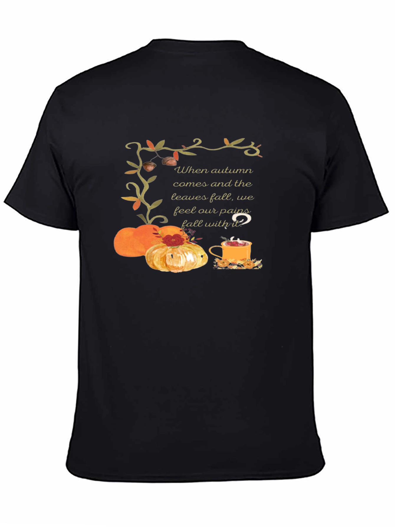 Embrace the autumn spirit with this unique t-shirt! The design features a charming scene with pumpkins, foliage, and a steaming cup of tea, all framed by decorative vines. The heartwarming phrase "When autumn comes and the leaves fall, we feel our pains fall with it" adds a touch of introspection to the cozy design. Made from comfortable, breathable fabric, this shirt is perfect for casual wear during the fall season. Whether you're sipping pumpkin spice lattes, visiting a pumpkin patch, or simply enjoying the crisp autumn air, this t-shirt will keep you feeling stylish and comfortable. Its eye-catching design also makes it a great conversation starter and a thoughtful gift for autumn lovers.