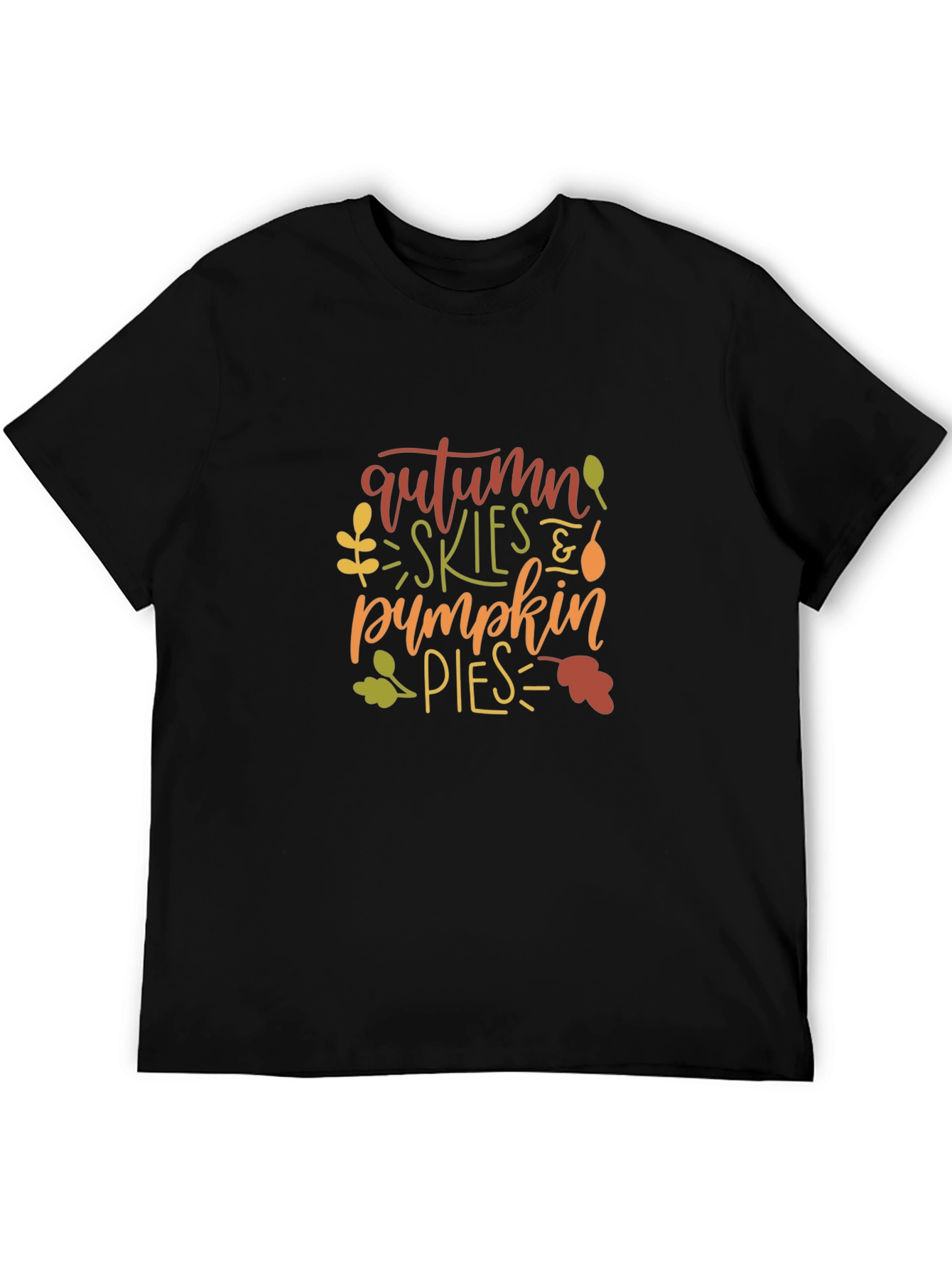 Embrace the cozy season with this stylish black t-shirt featuring a festive "Autumn Skies & Pumpkin Pies" graphic. The design incorporates charming fall elements like colorful leaves and playful typography in warm hues of orange, green, and brown. Made from comfortable, breathable fabric, this short-sleeved shirt is perfect for everyday wear. Whether you're heading to a pumpkin patch, enjoying a crisp autumn walk, or simply relaxing at home, this tee will keep you feeling festive and stylish. The classic black color makes it easy to pair with jeans, leggings, or skirts for versatile fall looks. A must-have addition to your seasonal wardrobe!