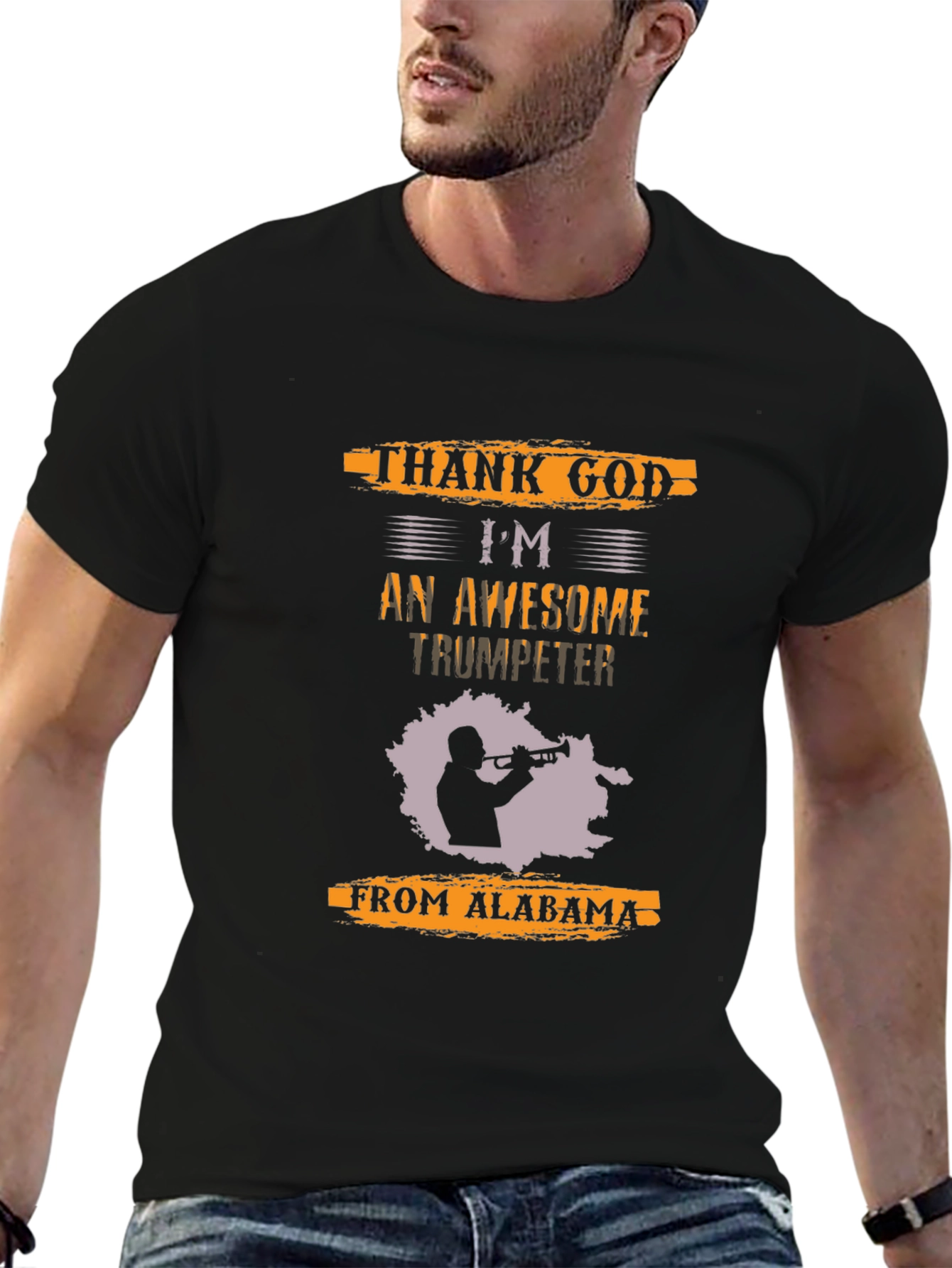 Show off your musical talent and state pride with this awesome black t-shirt. It features the phrase "Thank God I'm An Awesome Trumpeter" along with "From Alabama" in a bold, distressed font. A silhouette of a trumpeter adds a stylish touch. This comfortable tee is perfect for musicians who love Alabama. Wear it to band practice, concerts, casual outings, or any occasion where you want to express your passion for music and your home state. It is sure to be a conversation starter and a unique addition to your wardrobe. Get yours today!