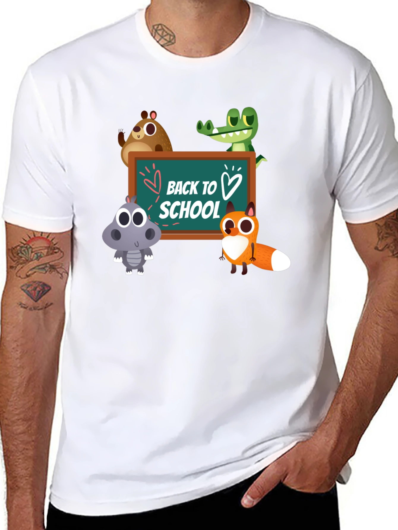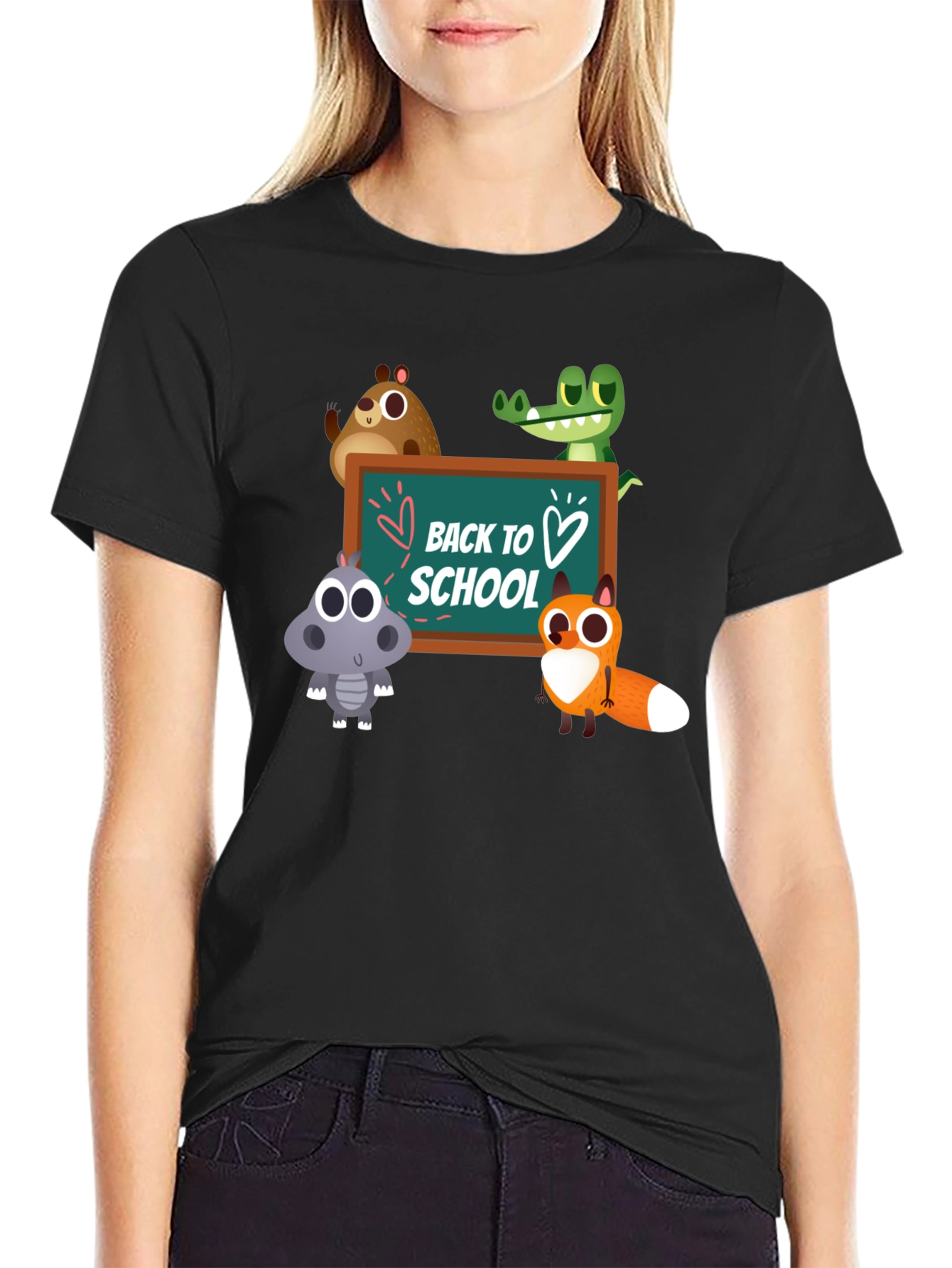 Get ready for back to school with this adorable black t-shirt! Featuring a charming cartoon graphic with a beaver, crocodile, hippo, and fox around a blackboard that says 'Back To School' adorned with cute hearts. This tee is perfect for students or teachers looking to add a touch of fun to their wardrobe. Made from a soft, breathable fabric, it ensures all-day comfort. Show off your enthusiasm for learning with this unique and playful design! Ideal for casual wear, classroom settings, or school events. Grab yours today and make a statement!