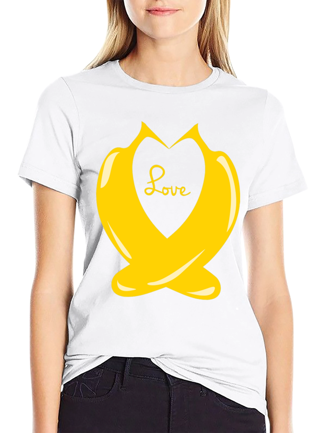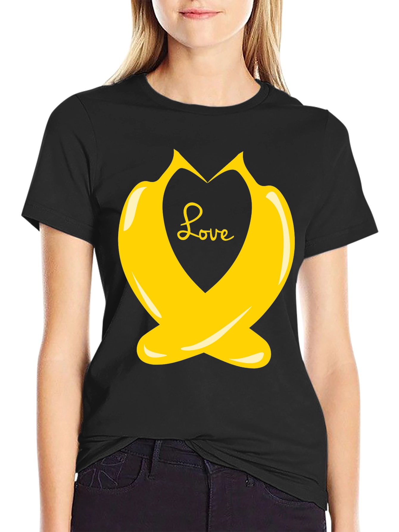 Show your playful side with this unique black graphic tee! The shirt features a vibrant yellow design of two bananas forming a heart shape, with the word 'Love' elegantly scripted in the center. This eye-catching design is sure to turn heads and spark conversations. Made from a comfortable material, this tee is perfect for casual wear, weekend outings, or expressing your fun-loving personality. It is versatile enough to be paired with jeans, shorts, or a skirt, making it a stylish addition to any wardrobe. Get ready to spread some love and laughter with this one-of-a-kind banana tee!