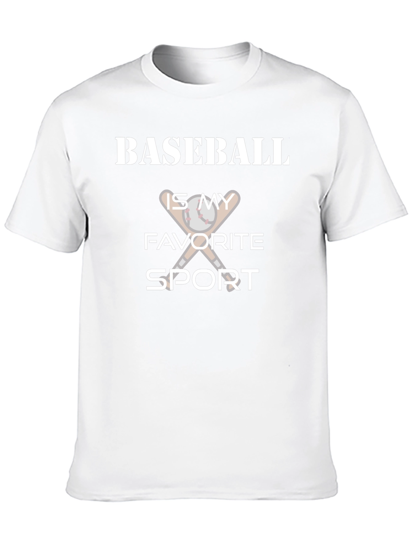 Show your love for America's pastime with this classic baseball-themed tee. This black t-shirt features a bold white graphic that reads "BASEBALL IS MY FAVORITE SPORT", complete with a stylized baseball and crossed bats. Crafted from a soft, comfortable fabric, this shirt is perfect for casual wear, baseball games, practices, or just lounging around. Its timeless design makes it a great addition to any baseball fan's wardrobe. Express your passion for baseball with this stylish and spirited tee.