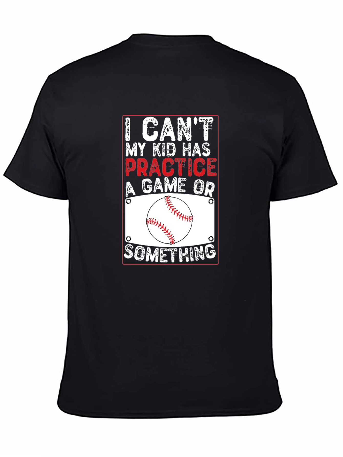 Show your dedication to your young baseball star with this comfortable and humorous t-shirt. The shirt features a bold graphic with the saying, "I CAN'T MY KID HAS PRACTICE A GAME OR SOMETHING", perfect for game days or casual wear. A stylized baseball graphic adds to the sporty theme. The shirt is made from a soft, breathable fabric, ensuring comfort whether you're in the stands or running errands. Makes a great gift for any baseball mom or dad who juggles their schedule for their kids' games and practices. Available in classic black, this tee will become a wardrobe staple.