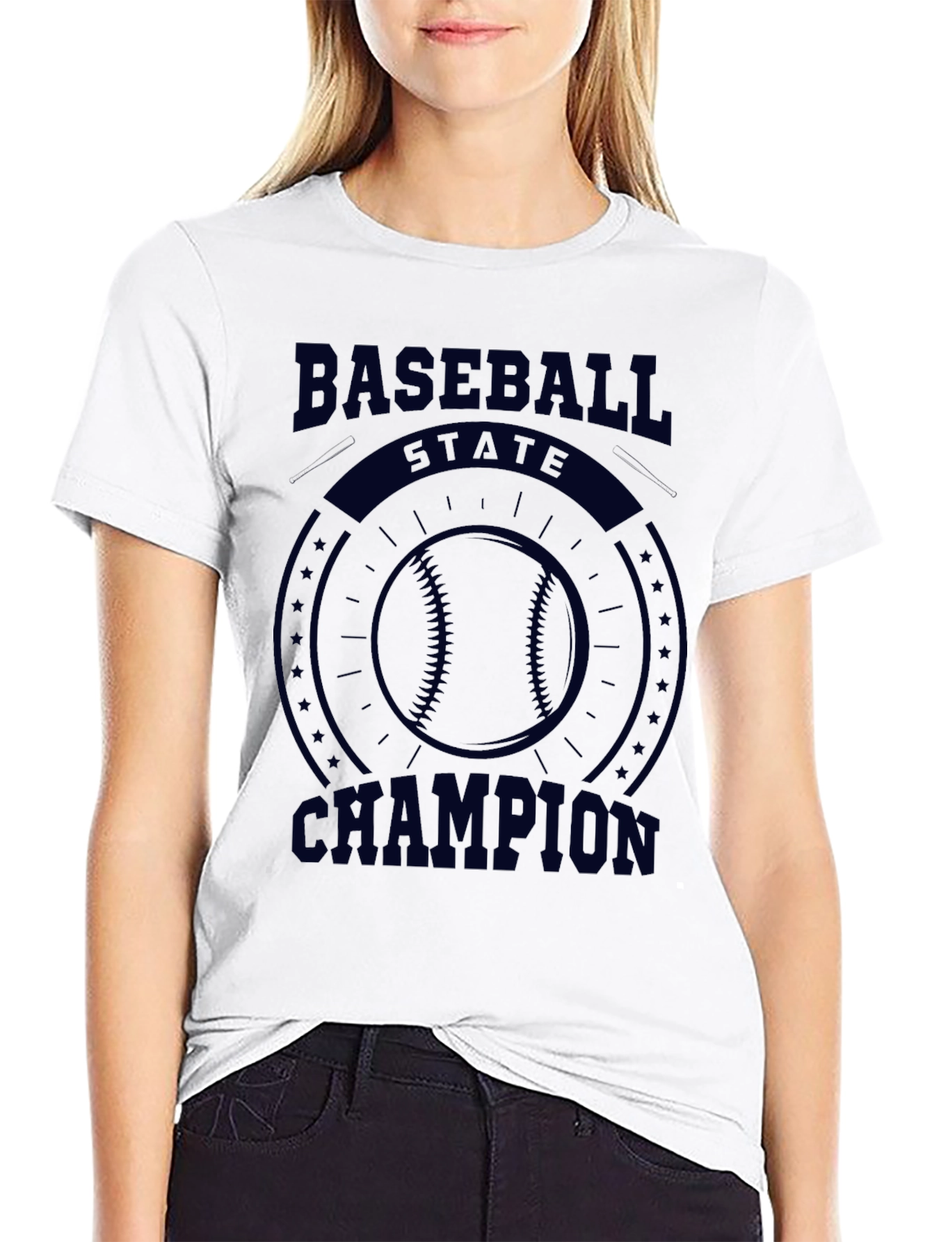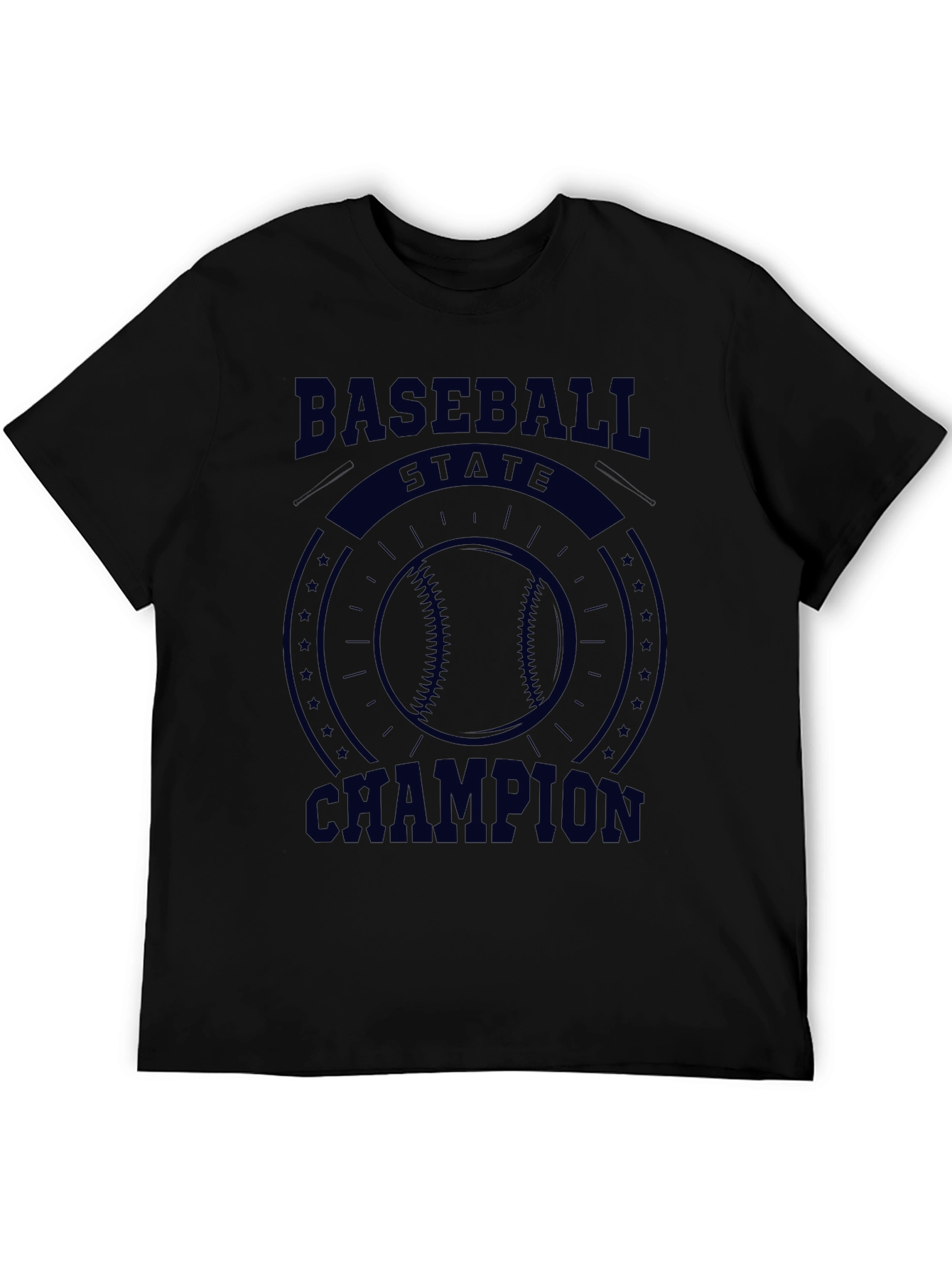 Show your love for baseball with this stylish black T-shirt. It features a bold graphic print with the words "Baseball State Champion" encircling a baseball design. The dark blue graphic stands out vividly against the black background, making it a perfect choice for casual wear. Made from a comfortable fabric, this T-shirt is ideal for everyday use, whether you're heading to a game, hanging out with friends, or simply relaxing at home. This shirt will surely add a sporty edge to your wardrobe. Get yours today and support your favorite sport with pride!