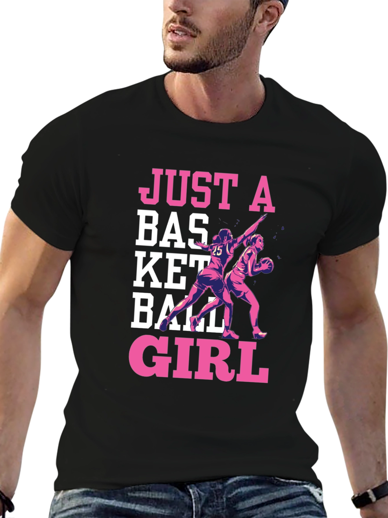 Show off your love for basketball with this stylish black t-shirt. Featuring a unique graphic design with two female basketball players in action and the words 'JUST A BASKETBALL GIRL', this tee is perfect for athletes and fans alike. The design incorporates bold pink and white lettering for a striking contrast. Made from a comfortable, breathable fabric, it's ideal for everyday wear, casual outings, or showing your support at games. This eye-catching shirt is a must-have for any basketball enthusiast's wardrobe.