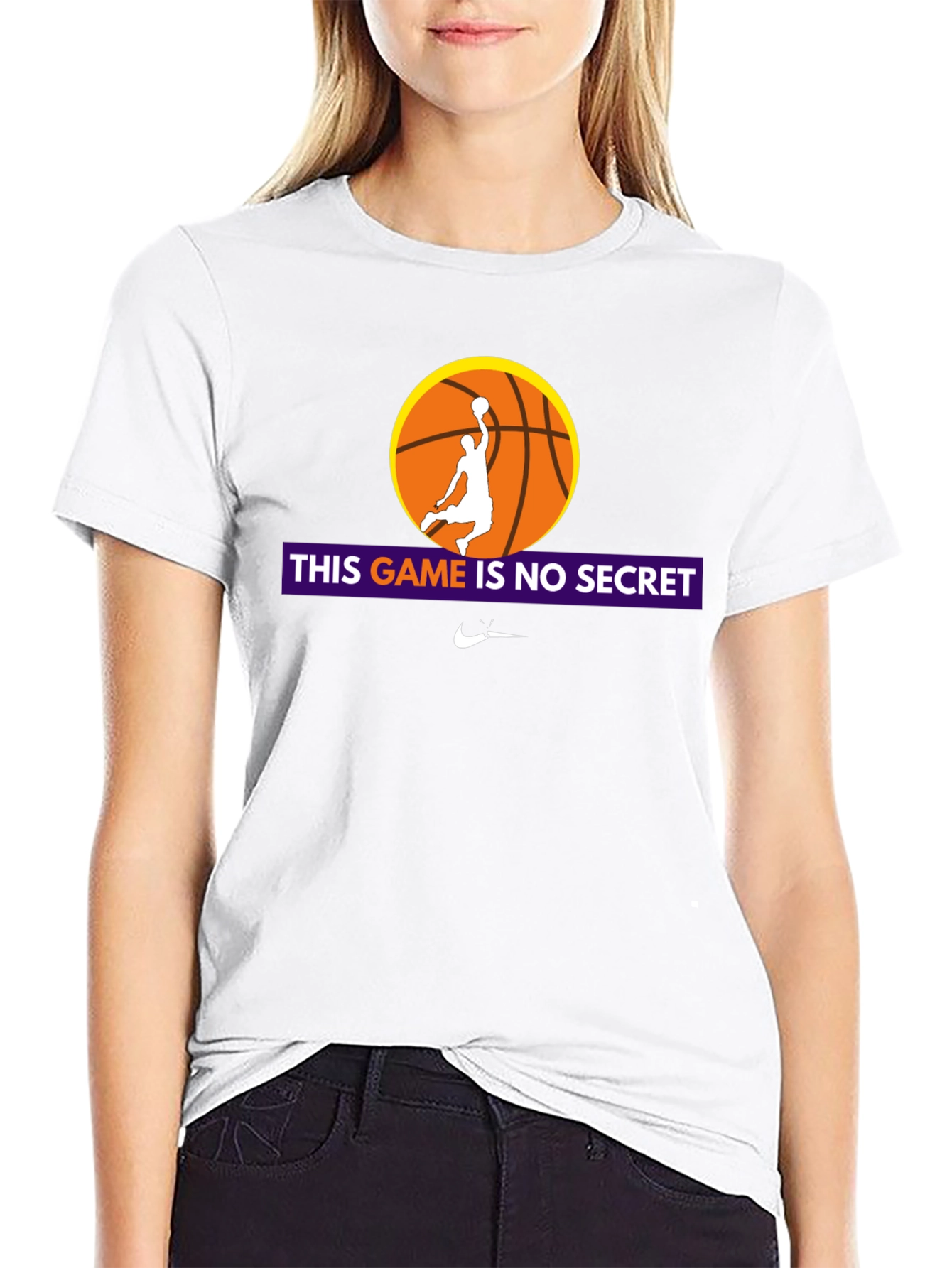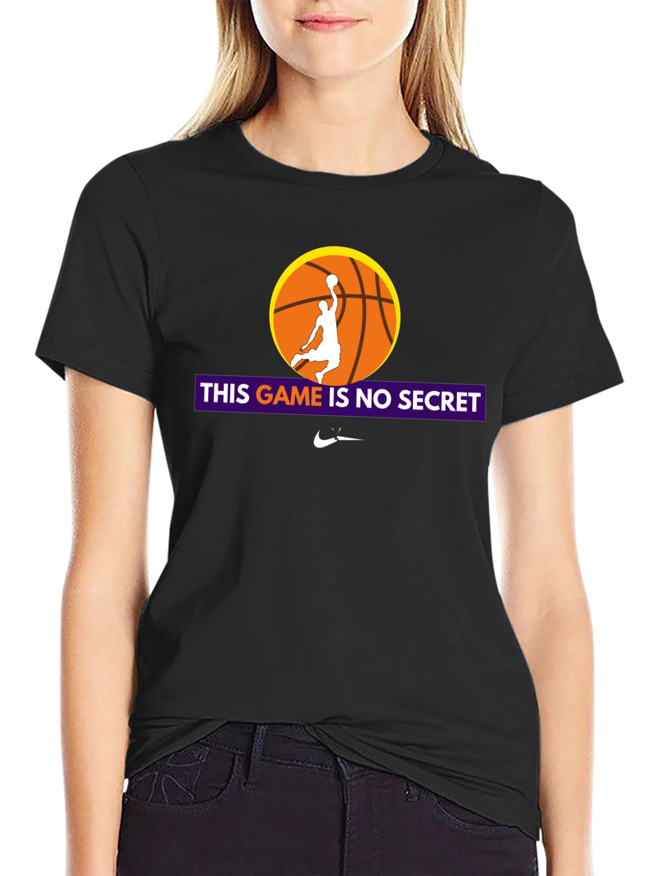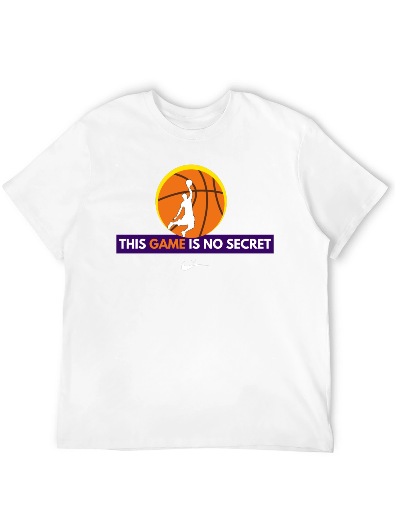 Showcase your love for basketball with this stylish black graphic tee. The shirt features a vibrant design with an orange basketball and a player silhouette mid-dunk. Bold lettering proclaims "This Game Is No Secret," making it a statement piece for any basketball enthusiast. Made from a comfortable, breathable fabric, this tee is perfect for casual wear, workouts, or cheering on your favorite team. The iconic logo adds a touch of sporty authenticity. Get ready to turn heads and express your passion for the game!