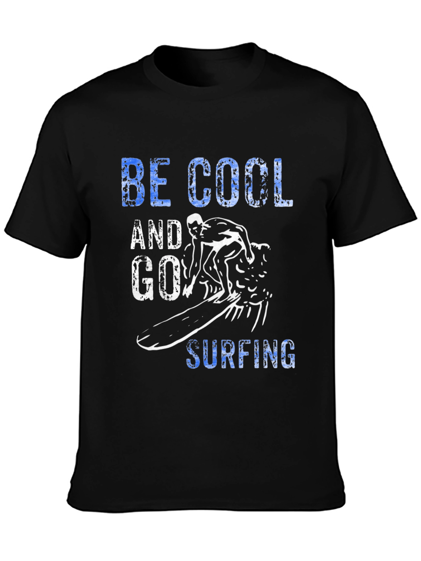 Ride the wave of style with this awesome graphic tee! Featuring a cool surfer design with the words 'Be Cool and Go Surfing', this t-shirt is perfect for beach lovers and surf enthusiasts. The shirt is made from a comfortable black fabric, likely a soft cotton blend, making it ideal for everyday wear. The design is in a stylish blue and white, giving it a trendy, vintage vibe. Whether you're hitting the beach, hanging out with friends, or just want to showcase your love for surfing, this t-shirt is a must-have addition to your wardrobe. Get yours today and make a splash!