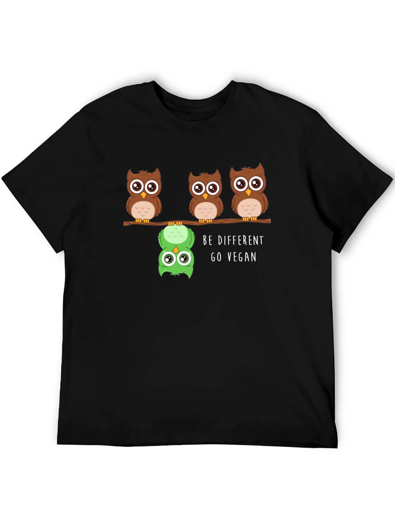Show off your unique style with this eye-catching black t-shirt. Featuring an adorable graphic of three brown owls perched on a branch, with a vibrant green owl hanging upside down, this tee playfully encourages individuality and a vegan lifestyle with the words "Be Different Go Vegan". Made from a comfortable-looking fabric, this short-sleeved tee is perfect for casual wear. The design is sure to spark conversations and spread a positive message. Ideal for everyday wear, vegan events, or as a gift for the conscious and stylish individual. Get yours today!