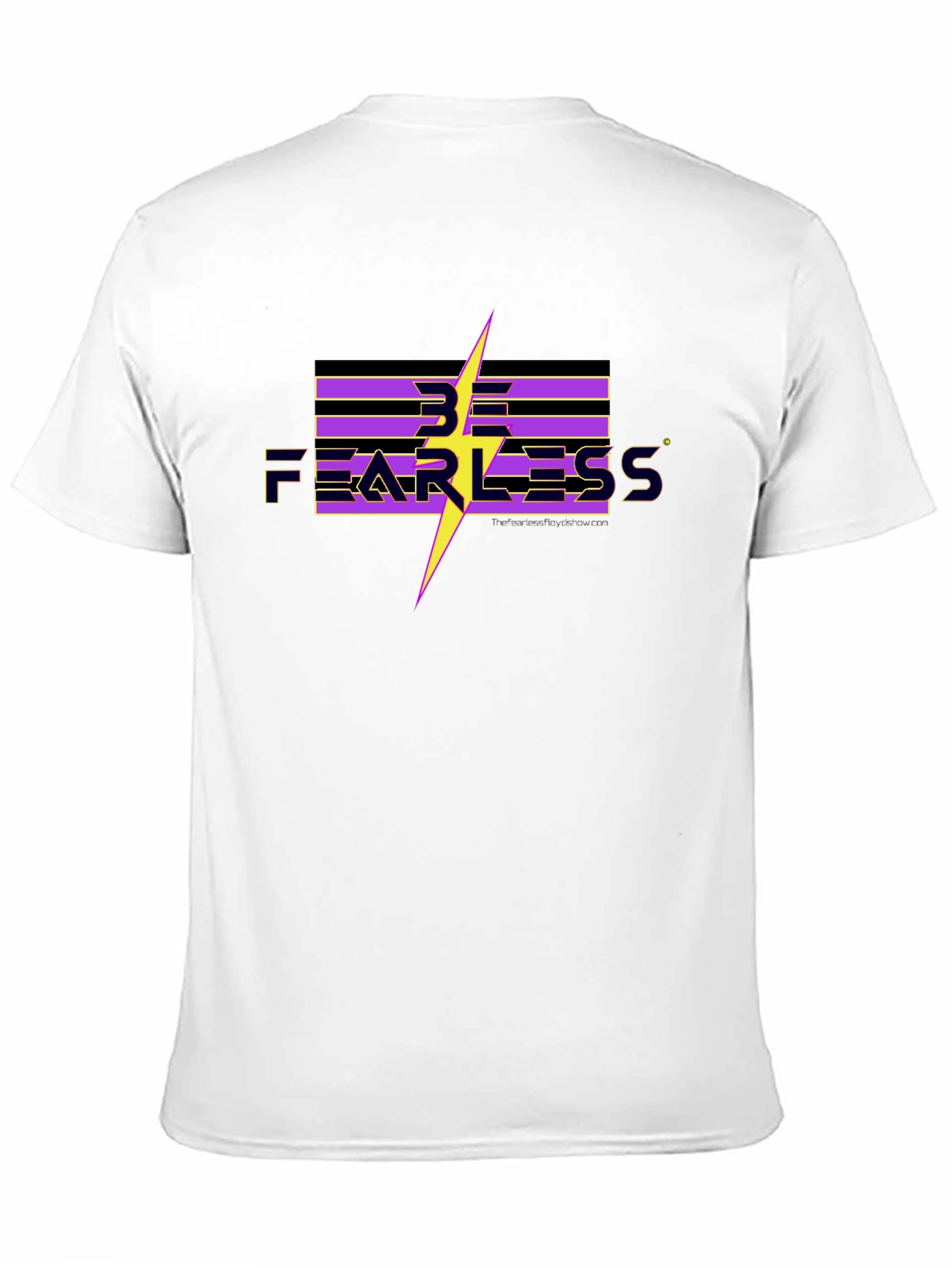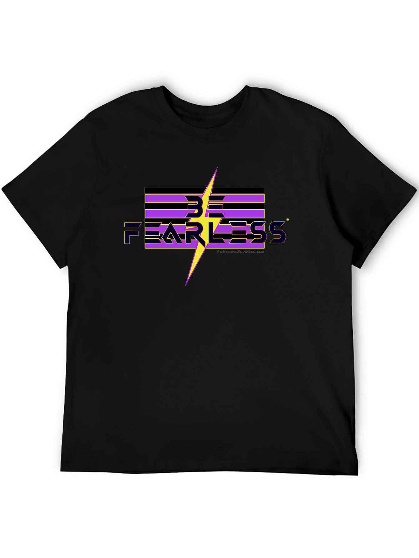 Show your fearless side with this stylish black graphic tee. Made from comfortable cotton, this t-shirt features a bold, eye-catching design. The "Be Fearless" text is set against a background of purple and black stripes, bisected by a striking gold lightning bolt. This unique design makes a powerful statement. Perfect for casual wear, workouts, or making a statement wherever you go. Comfortable and durable, this tee is sure to become a favorite in your wardrobe. Express yourself and embrace your inner boldness with this one-of-a-kind tee.