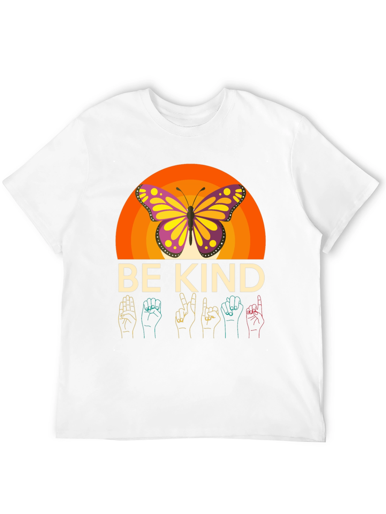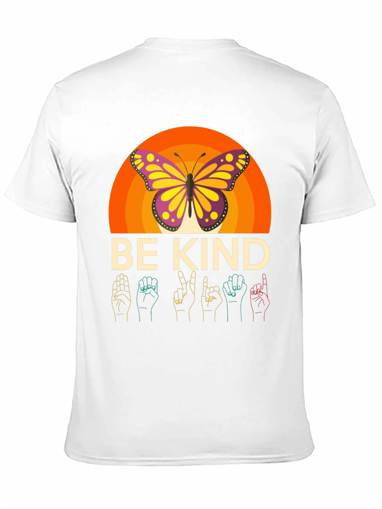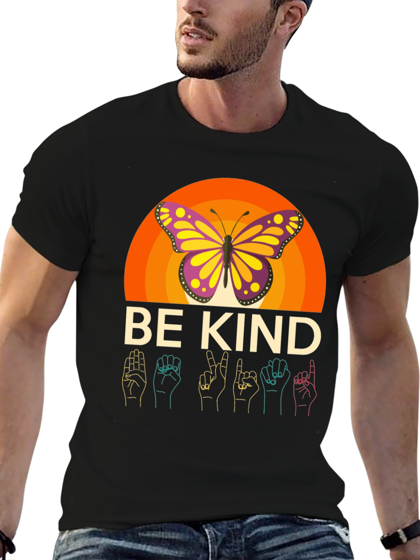 Spread positivity with this unique 'Be Kind' graphic tee. The shirt features a vibrant butterfly design set against a warm sunset backdrop, adding a touch of artistry to your casual wear. Below, the message "BE KIND" is uniquely displayed with sign language hand symbols, adding a distinctive and thought-provoking element. Made from a comfortable fabric, this t-shirt offers a relaxed fit, perfect for everyday wear. Ideal for those who value kindness and self-expression, this tee is a great way to make a statement. Perfect for casual outings, social events, or simply lounging at home.