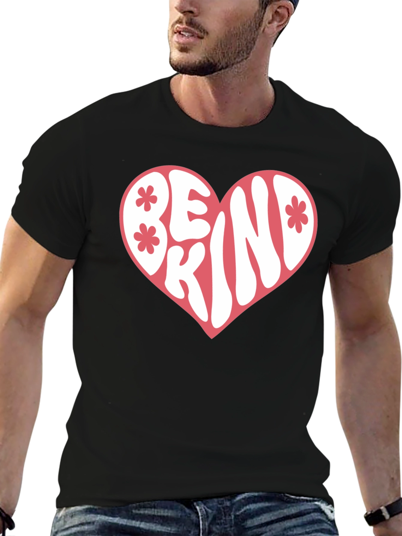 Spread positivity with this stylish black t-shirt featuring a unique 'Be Kind' design. The eye-catching graphic displays the words in a groovy, retro font, formed within a heart shape and accented with small flower details. Made from a comfortable, breathable fabric, this t-shirt is perfect for everyday wear. Ideal for casual outings, social events, or simply lounging at home, this statement piece lets you share an uplifting message wherever you go. The classic black color ensures it pairs effortlessly with jeans, shorts, or skirts. Showcase your compassionate side with this trendy and meaningful t-shirt!