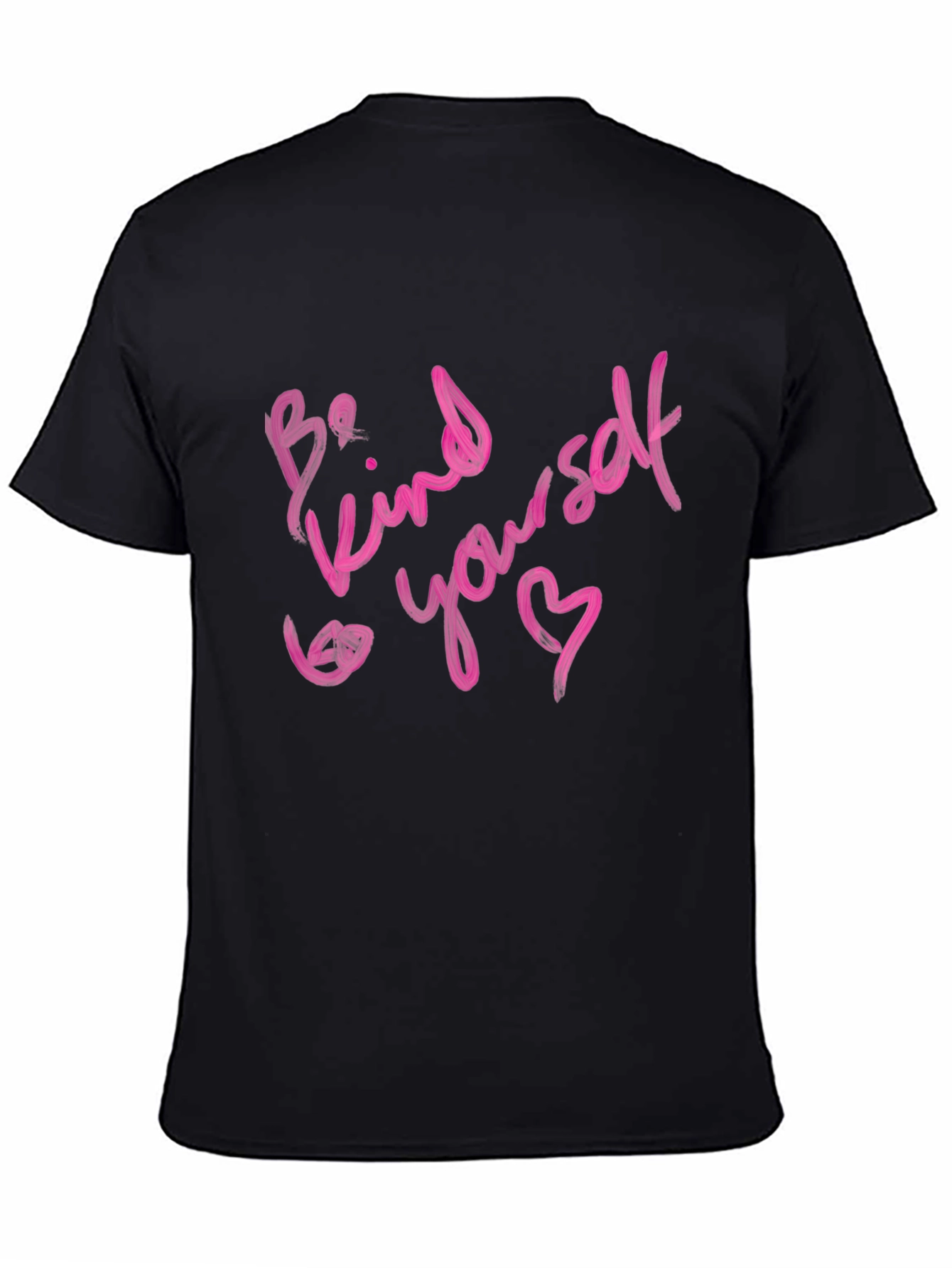 Show your self-love with this simple black t-shirt. This comfortable and casual black tee features a vibrant pink "Be Kind to Yourself" graphic, complete with a heart and kiss mark that adds a cute and flirty touch. Made from a soft, breathable fabric, this t-shirt is ideal for everyday wear. Pair it with jeans, shorts, or a skirt for a stylish and effortless look. This shirt is perfect for expressing your positive vibes and spreading a message of self-acceptance wherever you go.