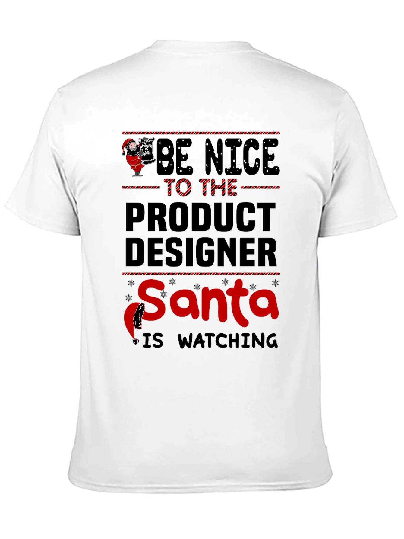 Show off your festive spirit with this funny t-shirt! The design features the message 'Be Nice to the Product Designer Santa is Watching'. Ideal for wearing during the holiday season or any time you want to spread some cheer. Made from comfortable fabric, this tee is perfect for everyday wear. Get yours now and let everyone know you're on Santa's nice list!