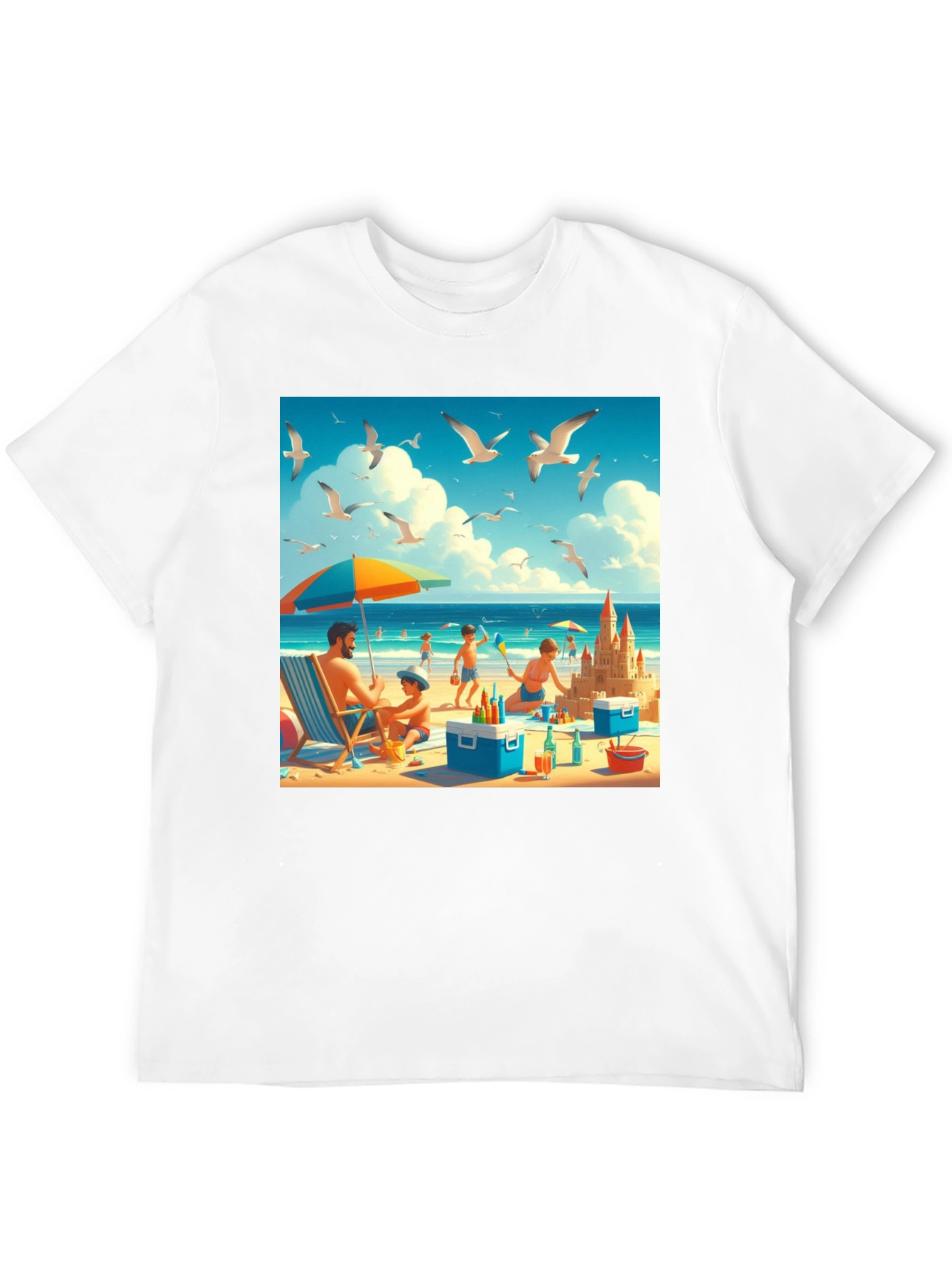Escape to the beach with this eye-catching graphic tee. Featuring a vibrant scene of a family enjoying a sunny day at the beach, complete with seagulls, beach umbrellas, and a sandcastle, this shirt is perfect for anyone who loves the coast. The image is printed on a soft, comfortable black tee that will quickly become a wardrobe favorite. Ideal for casual wear, beach outings, or simply showcasing your love for the ocean, this tee offers both style and comfort. Let your personality shine with this unique and vibrant graphic tee!
