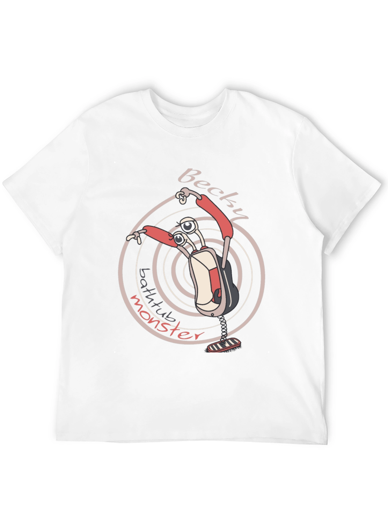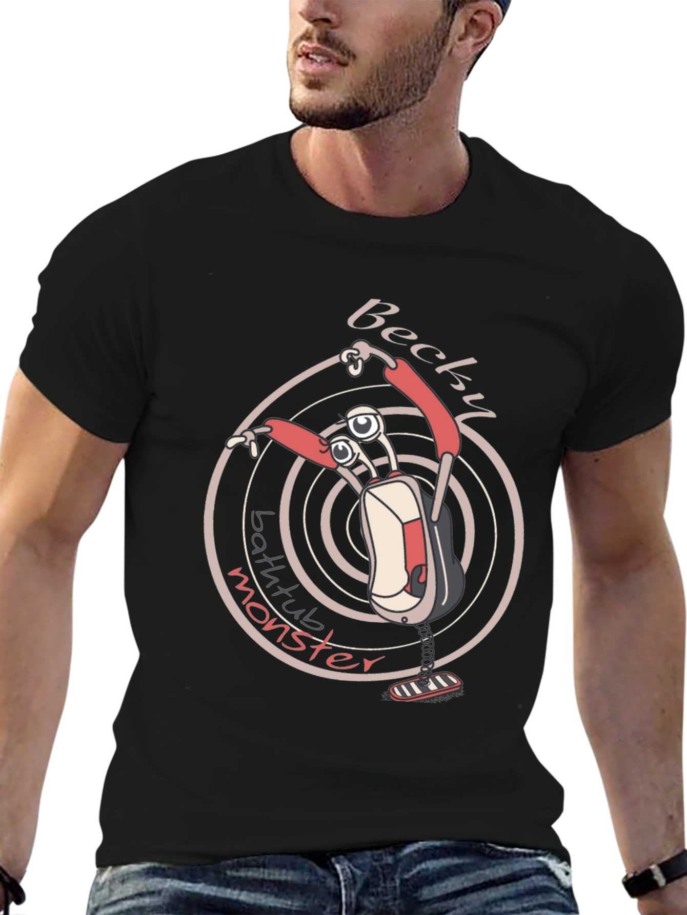 Show off your quirky side with this eye-catching graphic tee! This black t-shirt features a unique and playful design of a cartoonish "Becky Bathtub Monster". The design includes a stylized bathtub character with extendable arms in front of concentric circles. The whimsical graphic and soft fabric make it a comfortable and stylish choice for everyday wear. Perfect for casual outings, lounging at home, or expressing your unique personality. Grab this tee and add some fun to your wardrobe!
