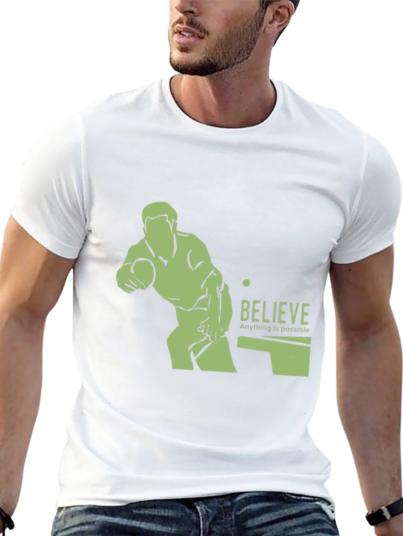 This stylish black t-shirt features a vibrant green graphic design of a table tennis player in action. Above a table, the design incorporates the inspiring word "BELIEVE" with the optimistic phrase "Anything is possible". The shirt is made from a comfortable-looking fabric that would be ideal for casual wear. Show off your passion for table tennis and your positive attitude with this standout tee. Great for athletes and anyone who loves a motivational message. Perfect for everyday wear, workouts, or simply relaxing in style.