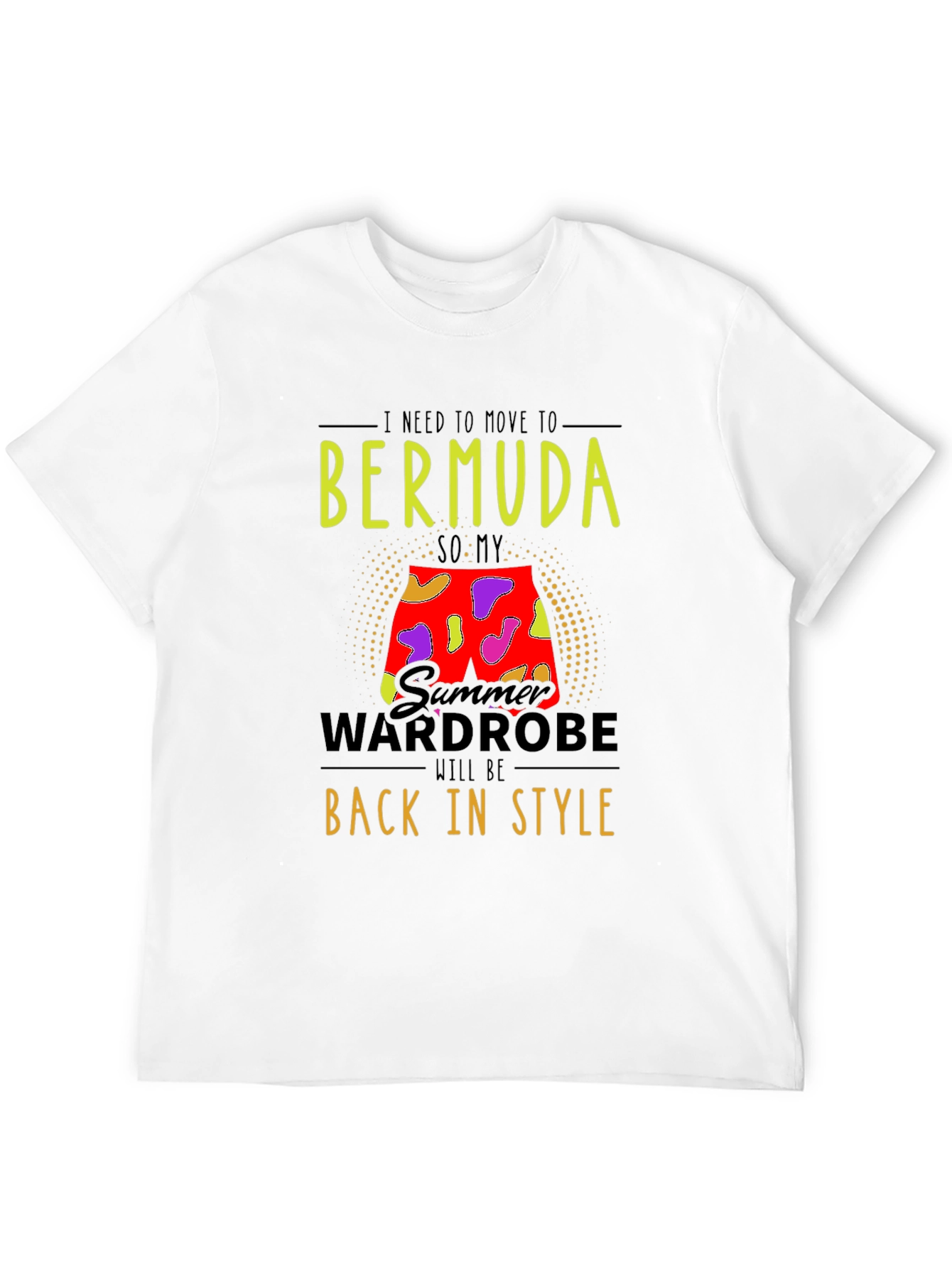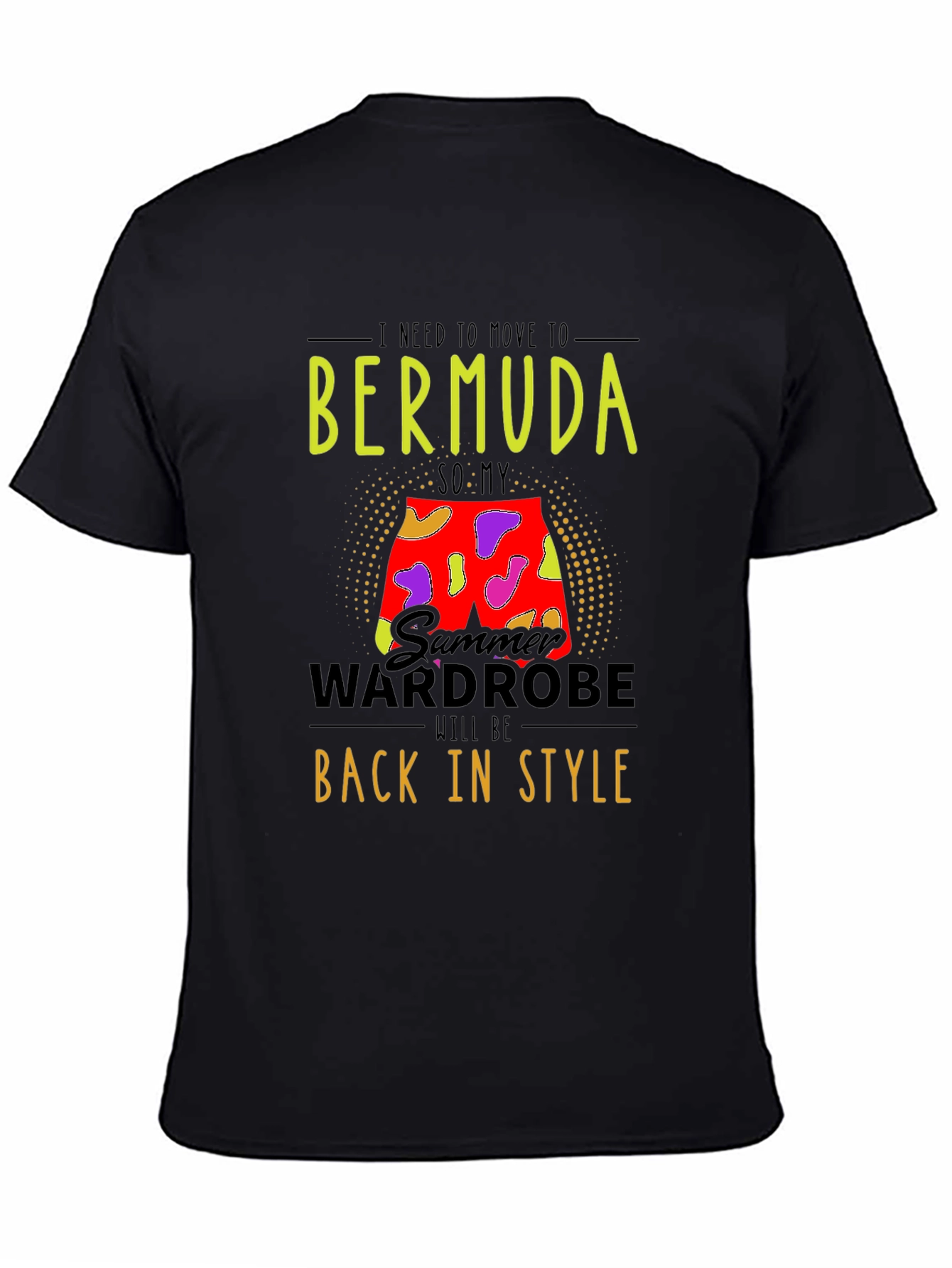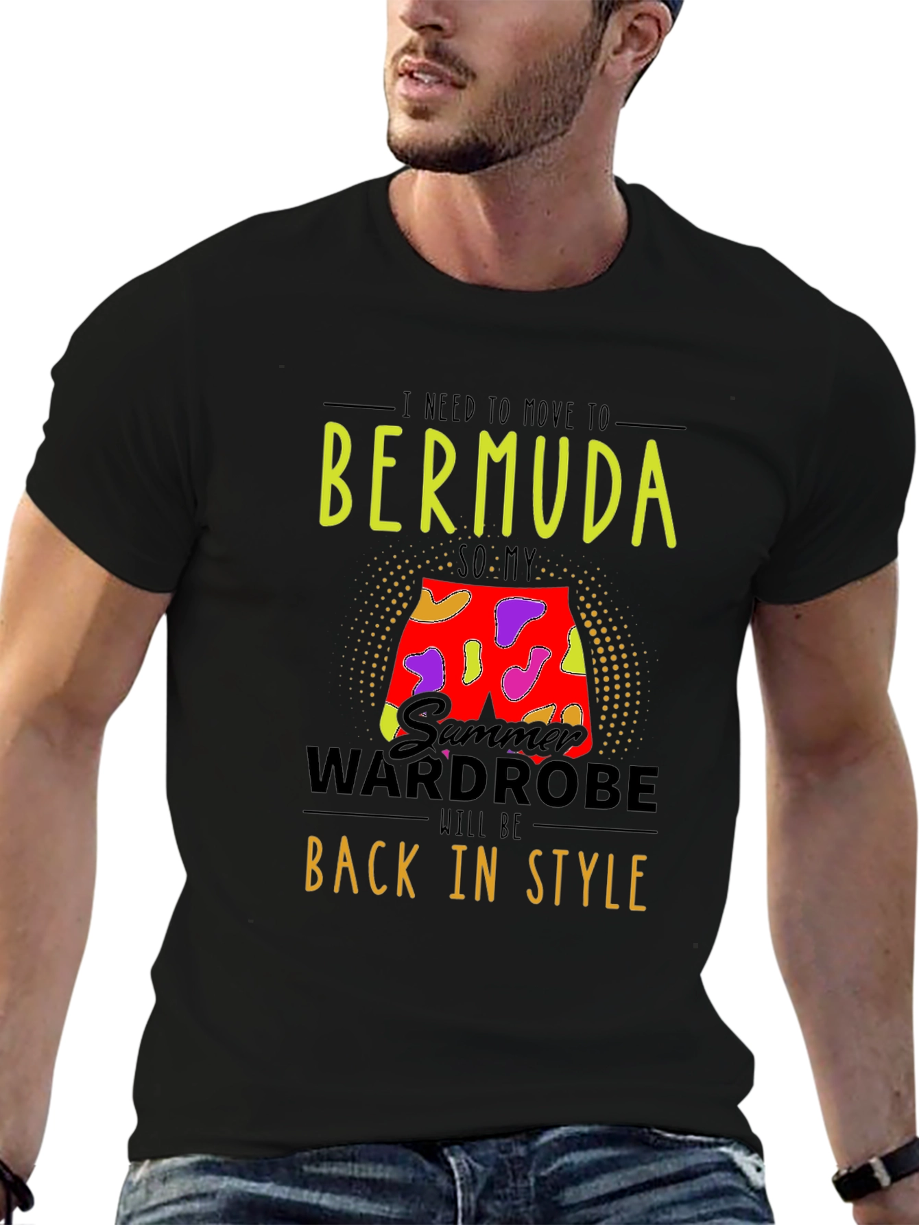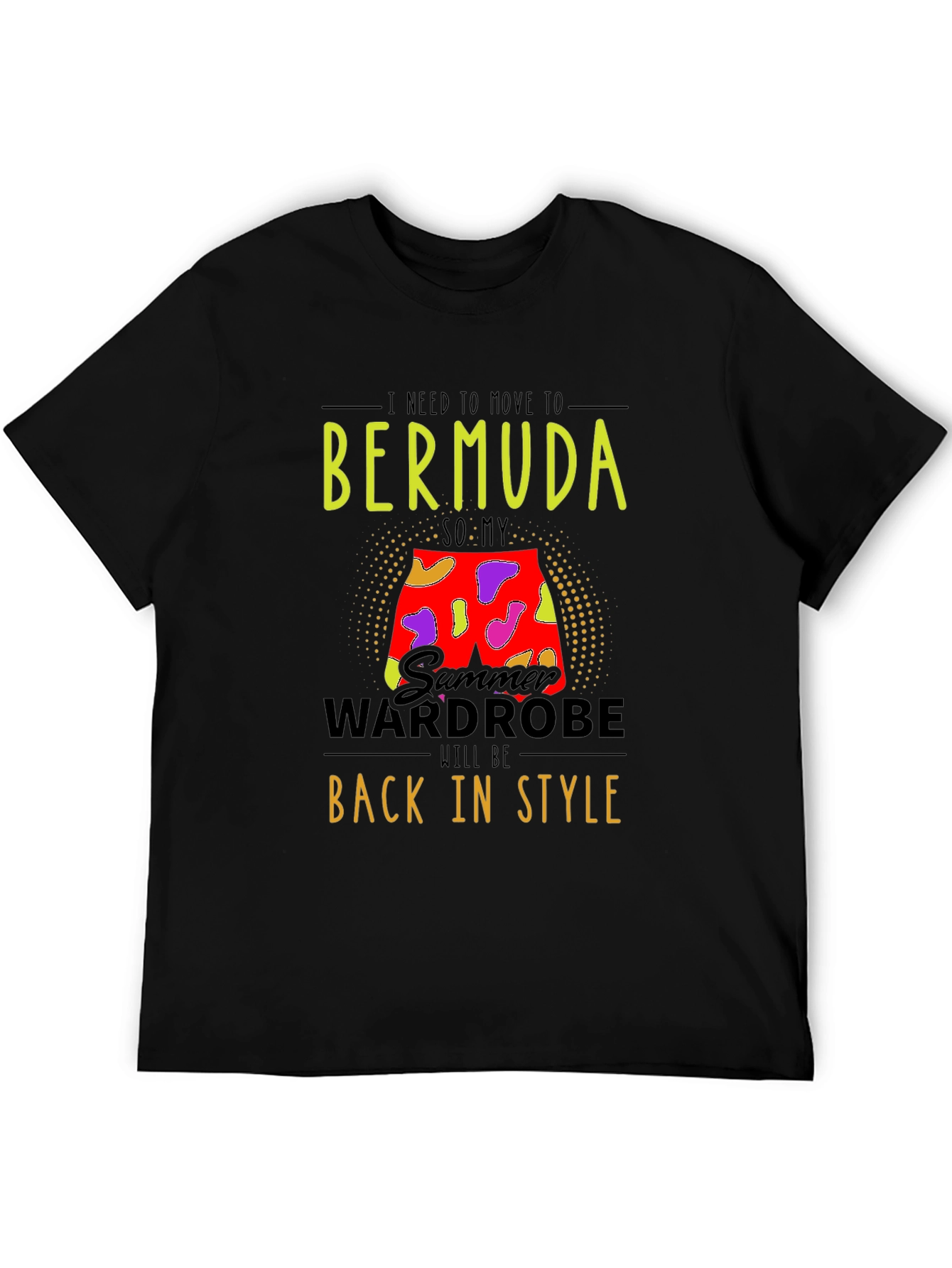 This black men's t-shirt features a humorous graphic design. The design includes the phrase "I NEED TO MOVE TO BERMUDA SO MY Summer WARDROBE WILL BE BACK IN STYLE." The word "BERMUDA" is prominently displayed in a bright yellow-green color. Below, a cartoon image of bright red swim trunks with colorful spot patterns adds a playful touch. Perfect for casual wear, this tee is sure to bring a smile and spark conversations. Wear it on vacation, at beach parties, or simply while lounging at home.