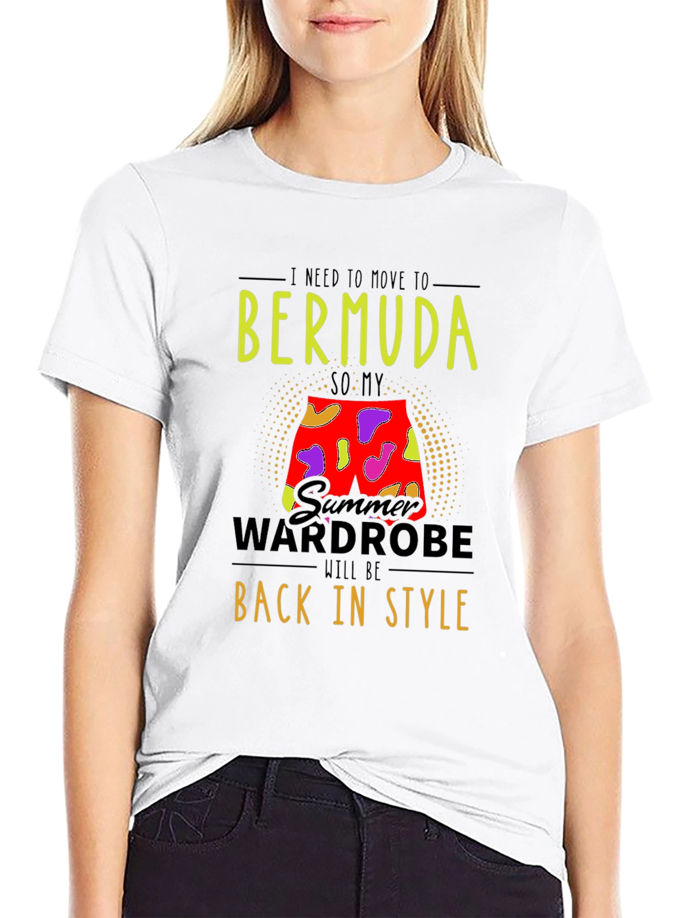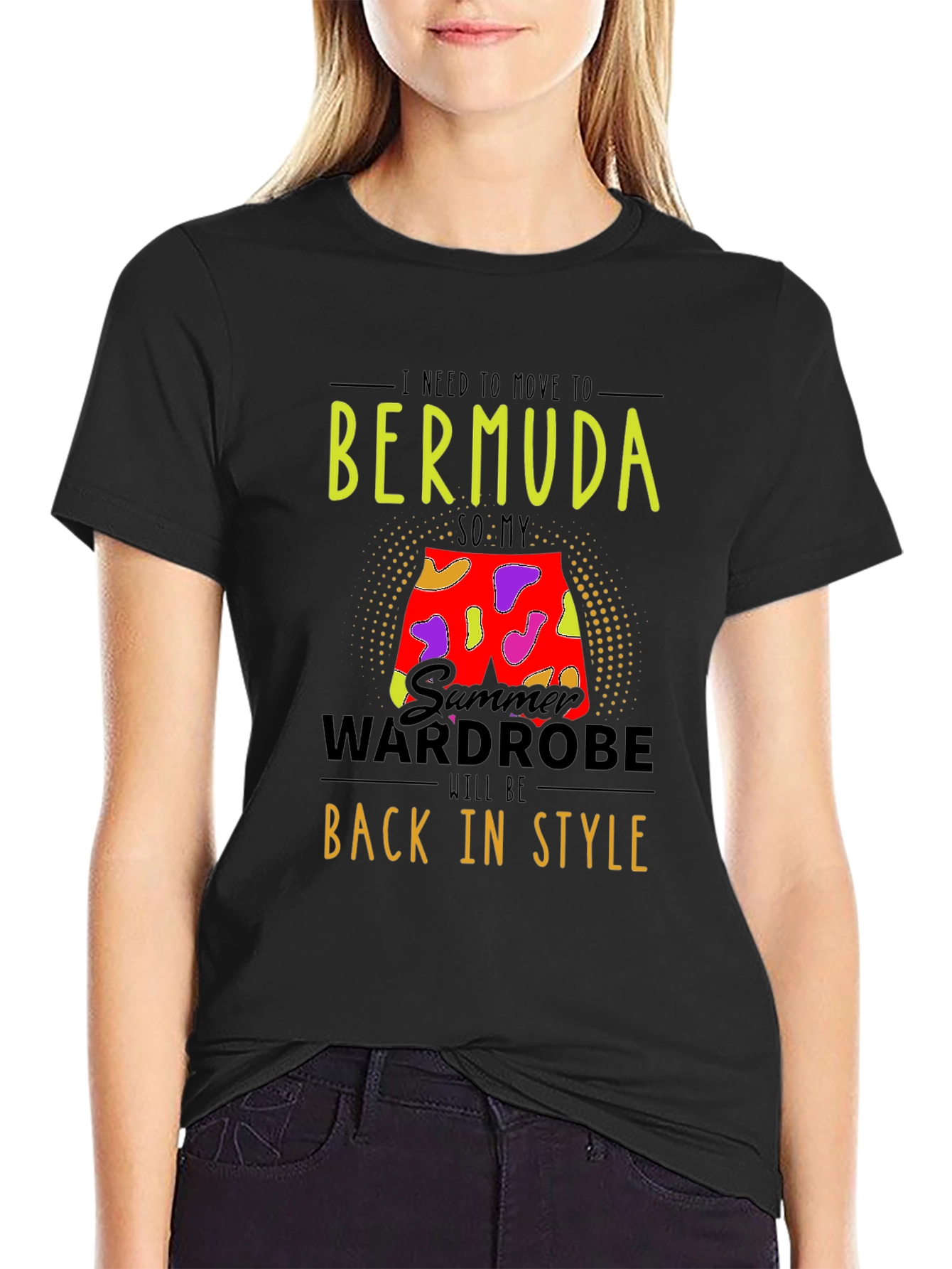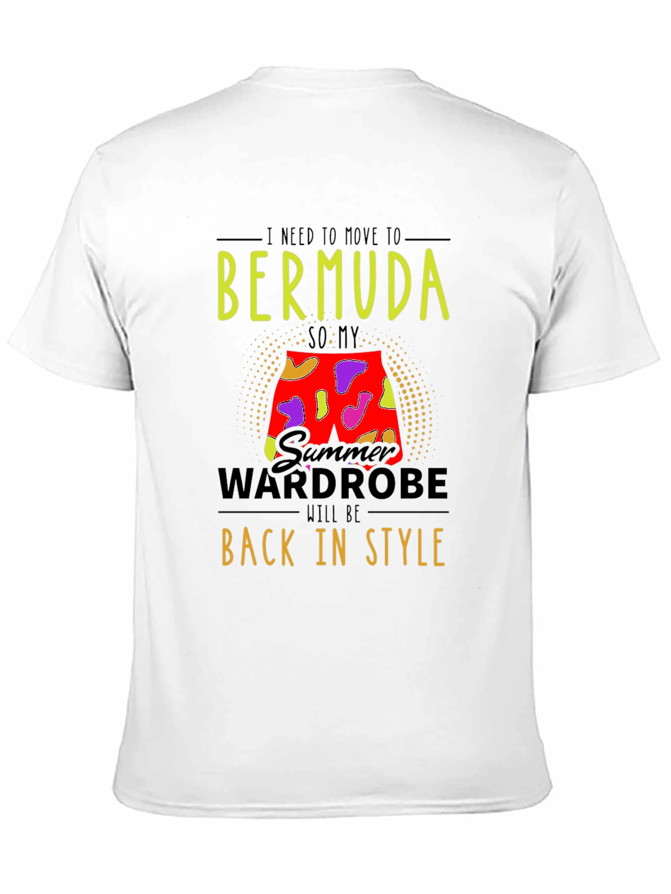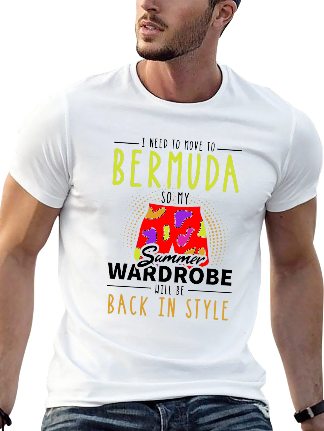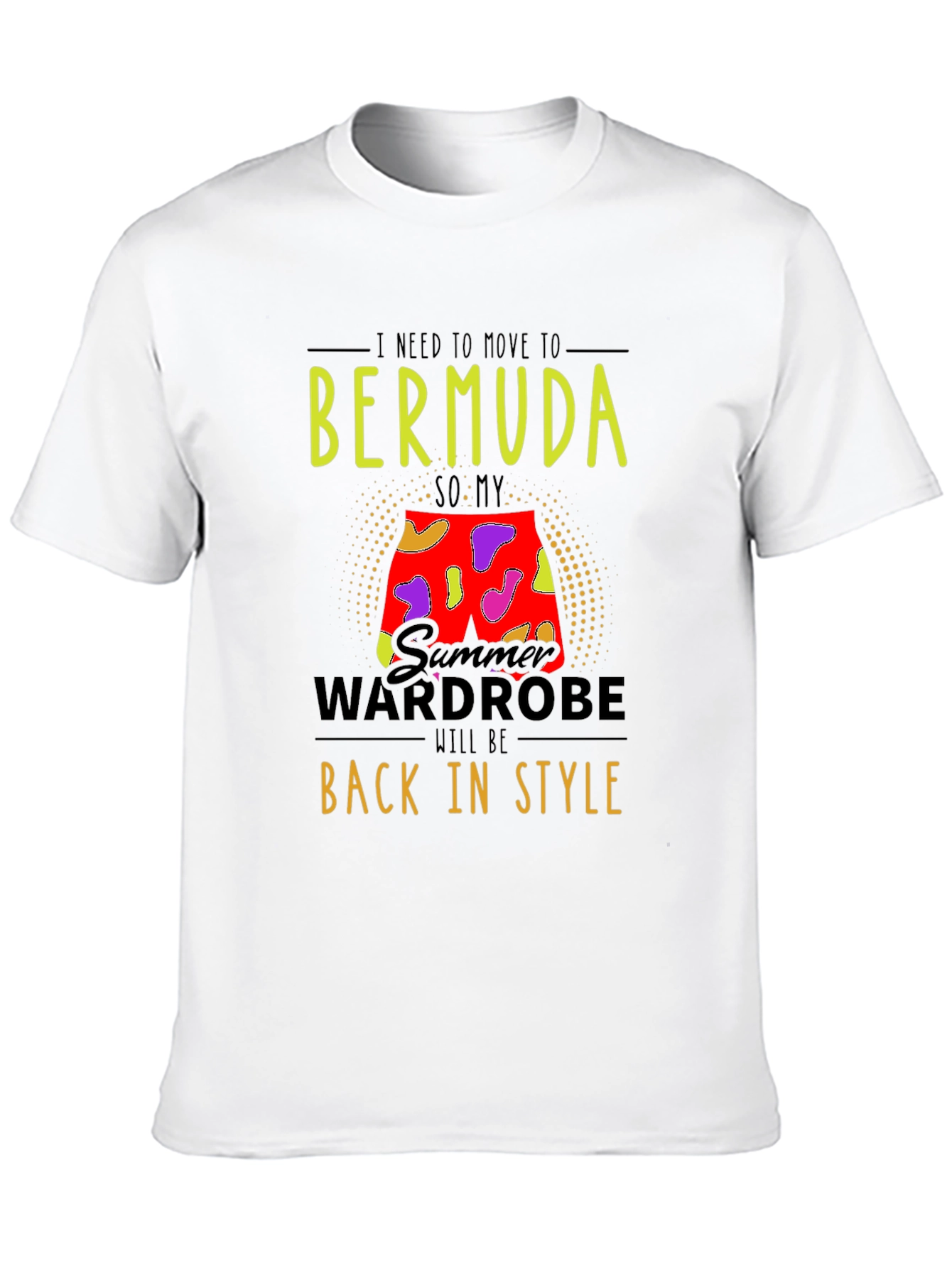 This black men's t-shirt features a humorous graphic design. The design includes the phrase "I NEED TO MOVE TO BERMUDA SO MY Summer WARDROBE WILL BE BACK IN STYLE." The word "BERMUDA" is prominently displayed in a bright yellow-green color. Below, a cartoon image of bright red swim trunks with colorful spot patterns adds a playful touch. Perfect for casual wear, this tee is sure to bring a smile and spark conversations. Wear it on vacation, at beach parties, or simply while lounging at home.