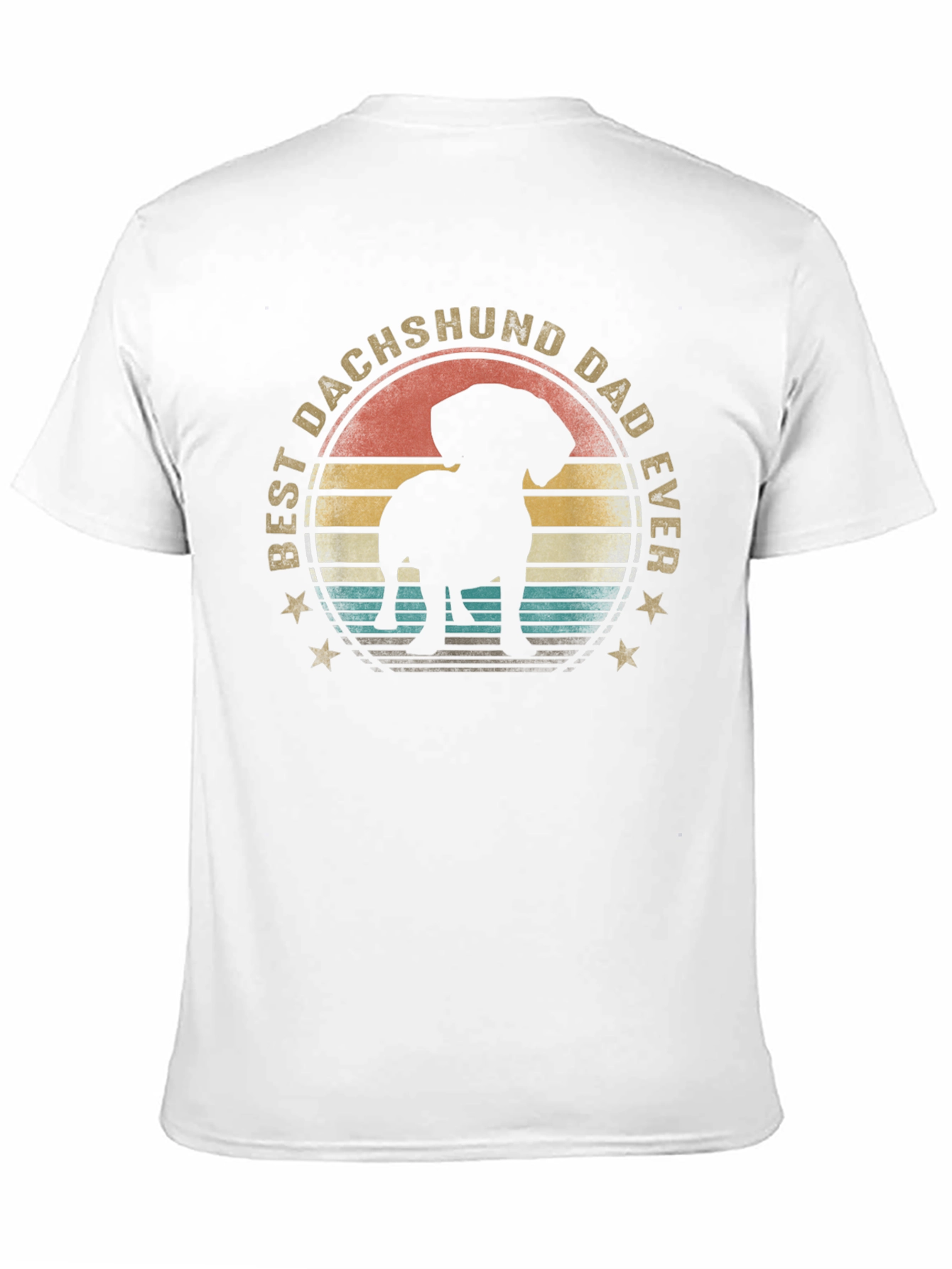 Show your love for your furry friend with this stylish black t-shirt. This tee features a retro-inspired graphic of a dachshund silhouette inside a circular design with the text "Best Dachshund Dad Ever." The faded color scheme and classic fit give it a vintage look, making it a great addition to any casual wardrobe. Perfect for dog lovers and proud dachshund owners, this shirt is sure to turn heads and spark conversations. Wear it on walks, to the dog park, or while relaxing at home - a perfect way to show your canine pride!