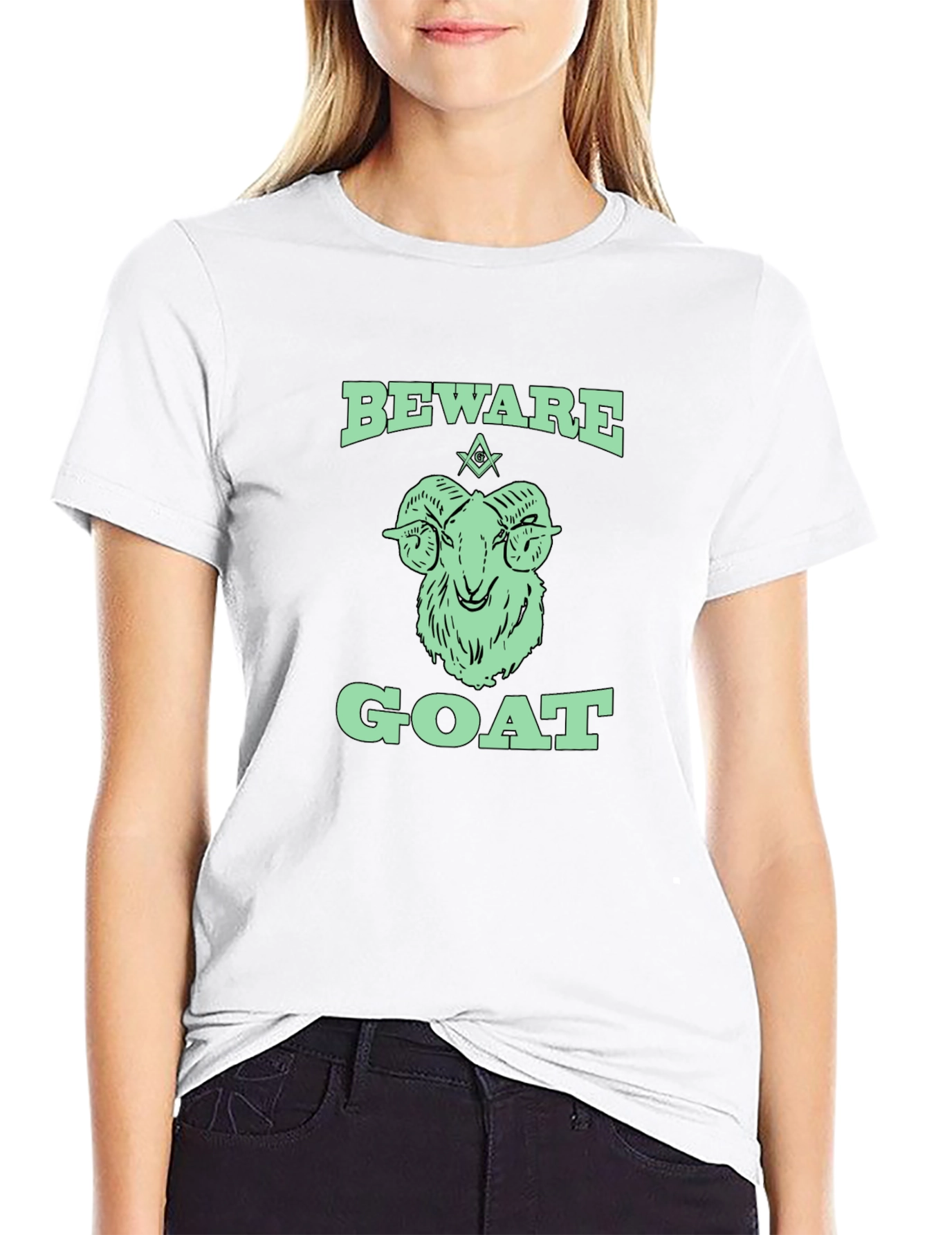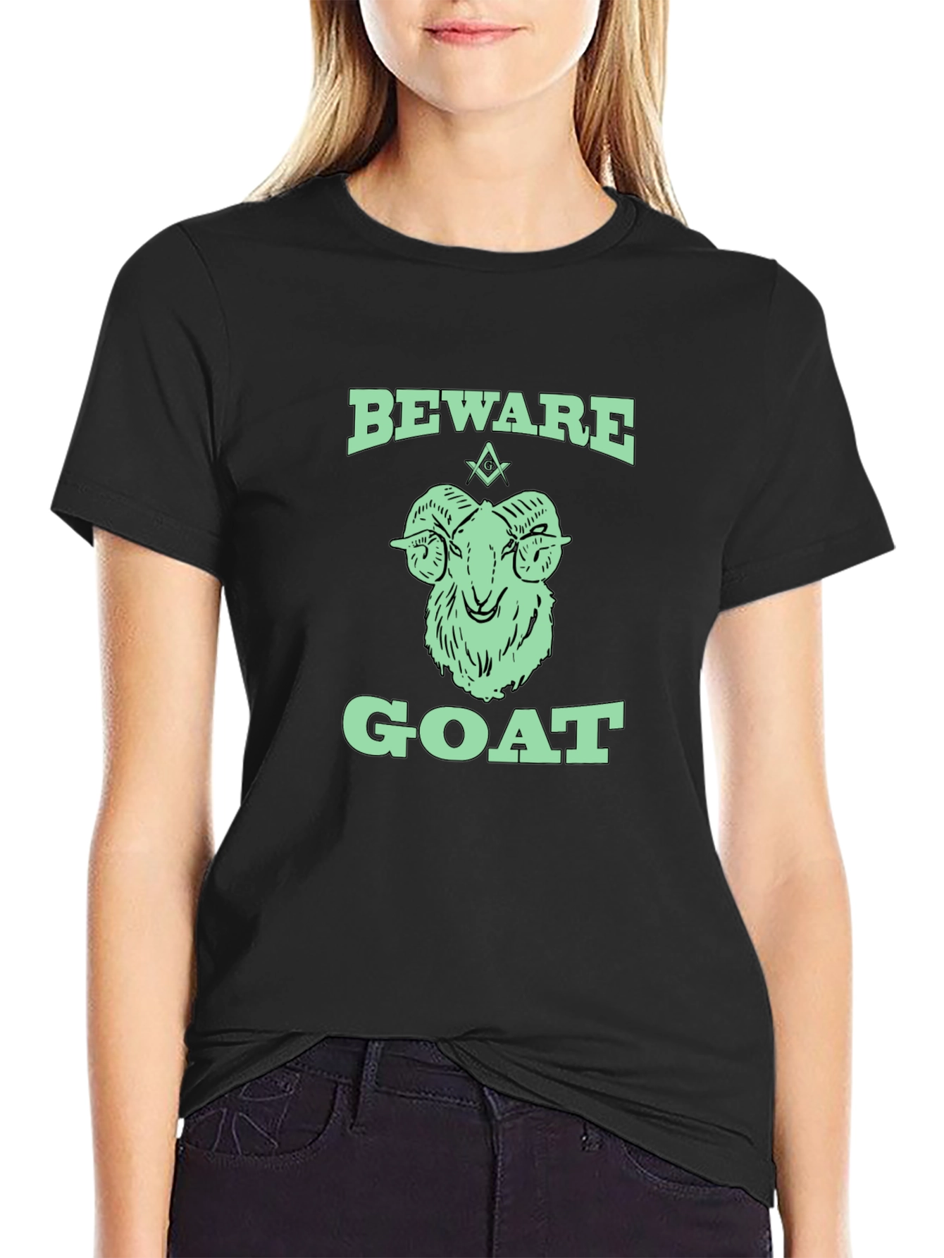 This black cotton t-shirt features a quirky and eye-catching graphic. The design includes the text "BEWARE GOAT" in a bold, light green font, accompanied by an illustration of a horned goat. The placement of the graphic is centered on the chest, making it a standout piece. This tee is perfect for casual wear, allowing you to express your unique sense of style. The relaxed fit and soft cotton material ensure comfort all day long. Pair it with jeans, shorts, or joggers for a versatile and fun outfit. Ideal for those with a sense of humor and a love for unique designs.