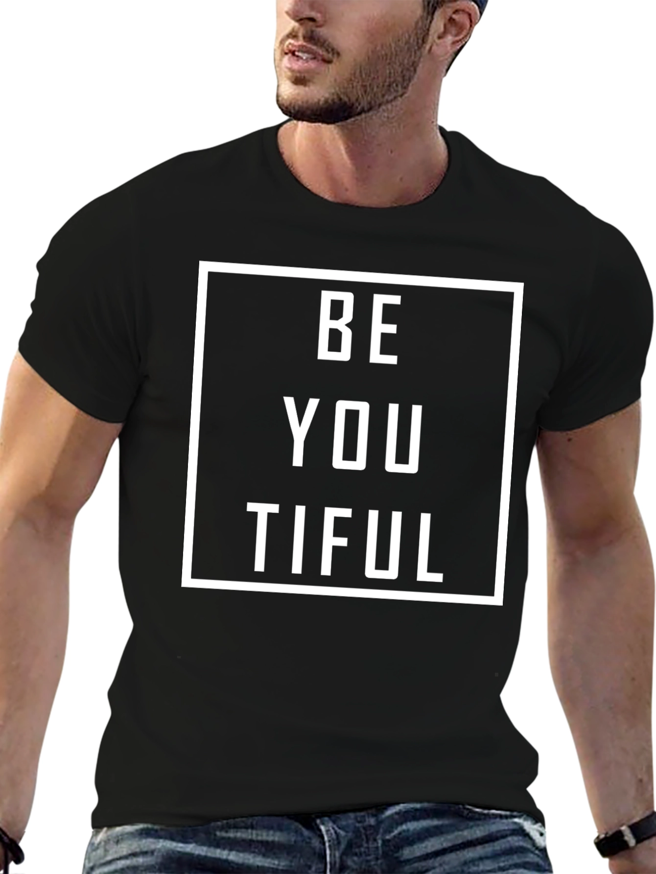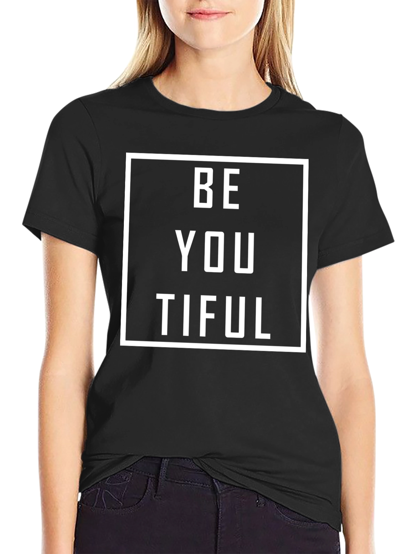 Embrace self-love and style with this striking black graphic tee. The design features the word 'BE YOU TIFUL' arranged vertically inside a crisp white square, making a bold and confident statement. Crafted from a soft-looking, comfortable fabric, this tee is perfect for casual wear, empowering you to express your authentic self wherever you go. Pair it with jeans, shorts, or a skirt for a versatile and fashionable look. Stand out from the crowd and inspire others with this simple, yet impactful message.