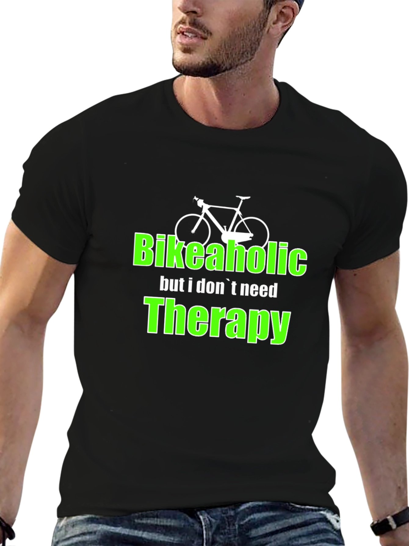 Show off your love for cycling with this unique Bikeaholic T-Shirt. This black tee features a playful graphic of a bicycle above the words "Bikeaholic" and the phrase "but i don't need Therapy" in a vibrant green font. Made from a comfortable fabric, this t-shirt is perfect for casual wear, biking events, or simply expressing your passion for two-wheeled adventures. The design is eye-catching and sure to spark conversations with fellow cycling enthusiasts. A great gift for the bike lover in your life, or a fun addition to your own wardrobe. Wear your biking pride!