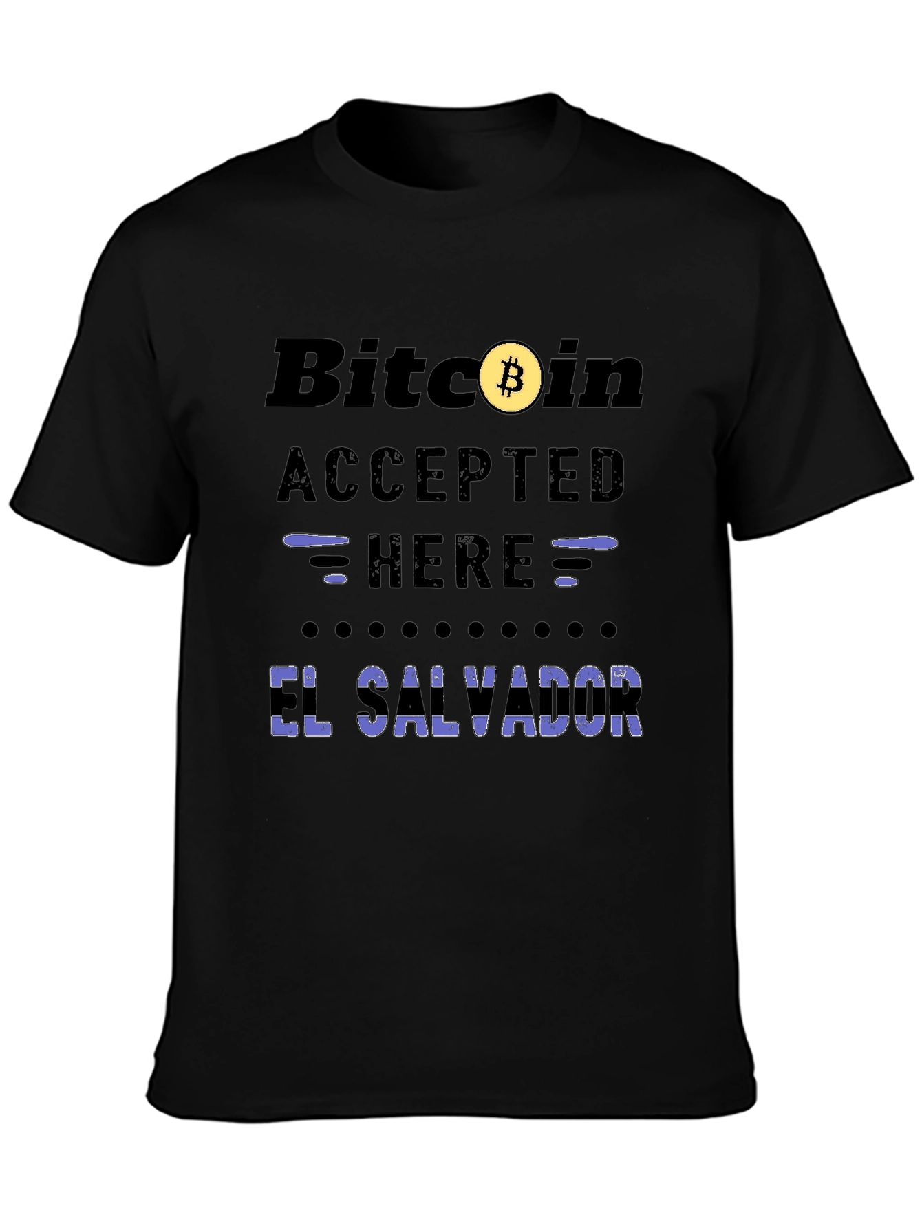Show your support for cryptocurrency with this unique Bitcoin Accepted Here T-shirt! This black tee features a bold design with "Bitcoin ACCEPTED HERE" and "EL SALVADOR" in a striking font. A Bitcoin symbol replaces the 'o' in Bitcoin. Made from what appears to be soft, comfortable fabric, this shirt is perfect for casual wear, crypto meetups, or just showing off your forward-thinking style. Get yours today and represent the future of finance!