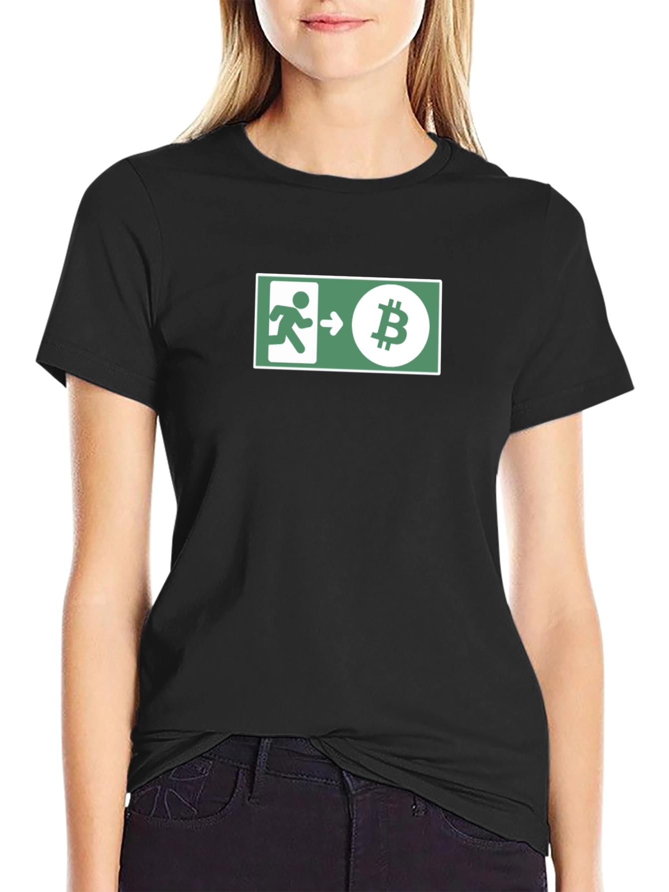 Show your crypto sense of humor with this unique t-shirt. The design features a playful take on the standard emergency exit sign, replacing the exit symbol with the Bitcoin "B" symbol. This comfortable, black tee is made from what appears to be a soft, breathable fabric, making it ideal for everyday wear. It's perfect for crypto enthusiasts, investors, and anyone who enjoys a clever, conversation-starting design. Wear it to meetups, conferences, or just around town to showcase your crypto pride and spark a few laughs. A great gift for the bitcoin lover in your life!