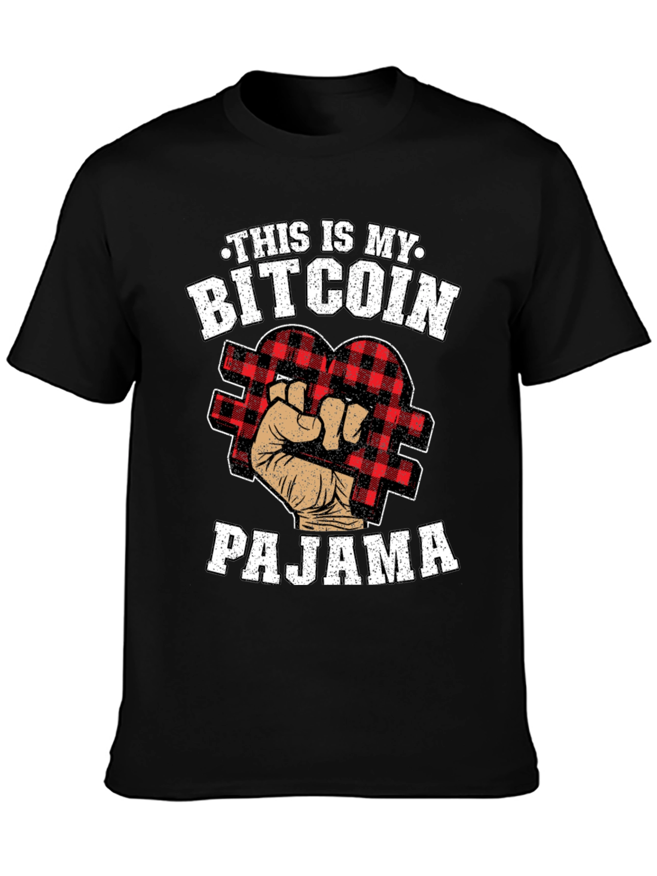 Show off your love for cryptocurrency with this unique t-shirt! This black tee features a bold graphic design with the phrase "THIS IS MY BITCOIN PAJAMA" printed in a distressed white font. The Bitcoin symbol is creatively incorporated into the design, rendered in a striking red plaid pattern with a fist. The soft fabric ensures comfort, making it perfect for lounging at home or casual wear. It is a great conversation starter. Ideal for crypto enthusiasts, investors, and anyone who appreciates a fun and quirky design. Makes a great gift!