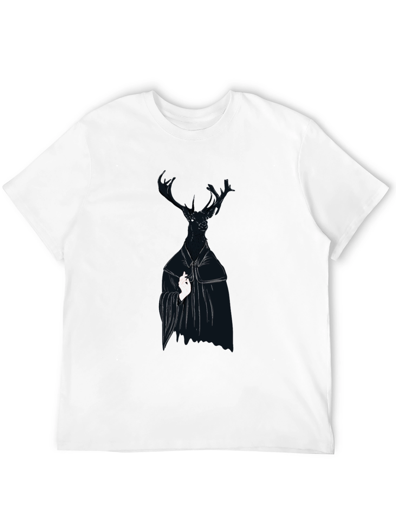 Embrace your unique style with this striking black graphic tee. The shirt features a captivating deer design with antlers, adorned in dark robes and a white accent. The image creates a visually arresting contrast on the black t-shirt. Made from a soft-looking fabric, this tee offers both comfort and style. Perfect for casual outings, concerts, or as a statement piece in your wardrobe. Show off your individuality and make a bold impression with this must-have graphic tee.