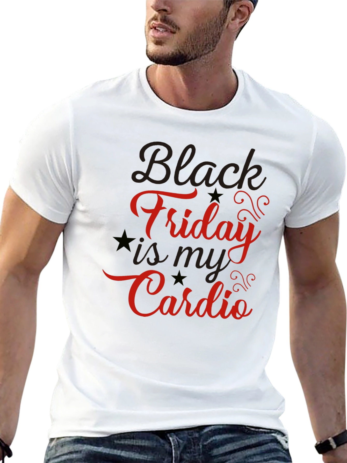 Show your love for Black Friday shopping with this unique t-shirt! Featuring a bold design that reads "Black Friday is my Cardio" in eye-catching red and black lettering, this tee is perfect for avid shoppers. Made from comfortable fabric, it's ideal for those long shopping days. This shirt is great for wearing while waiting in line on Black Friday or for casual wear to show off your passion for finding the best deals. Let everyone know that shopping is your favorite form of exercise!