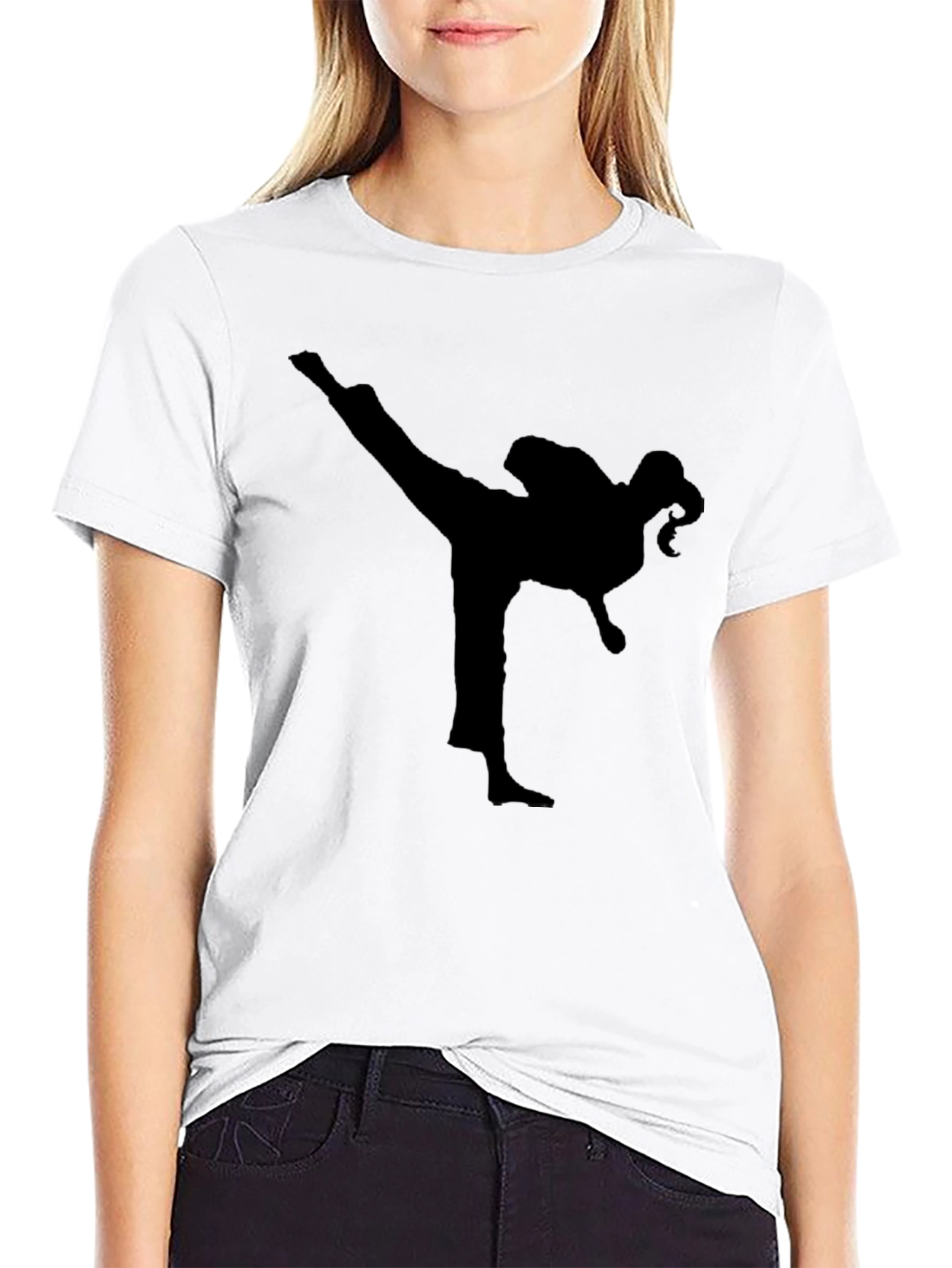 Showcase your passion for martial arts with this striking black t-shirt. This tee features a bold silhouette of a karate practitioner in mid-kick, making a powerful statement. Crafted from a comfortable-looking, soft fabric, this shirt is perfect for everyday wear or workouts. The design is eye-catching and unique, ideal for those who love martial arts, fitness, or simply appreciate cool graphic tees. Wear it to the gym, casual outings, or martial arts class to express your dedication and style.