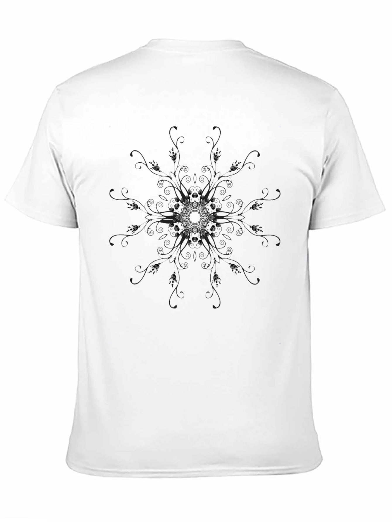 This stylish black t-shirt features an intricate mandala graphic design on the chest. The detailed white pattern stands out beautifully against the dark fabric. Made from a comfortable, soft-to-the-touch material, this tee offers a relaxed fit, making it perfect for everyday wear. The unique design adds a touch of artistry to your casual wardrobe. Wear it with jeans or shorts for a laid-back yet fashionable look. Whether you're heading to a concert, hanging out with friends, or simply relaxing at home, this mandala tee is a versatile and eye-catching choice. Upgrade your wardrobe with this must-have graphic tee today!