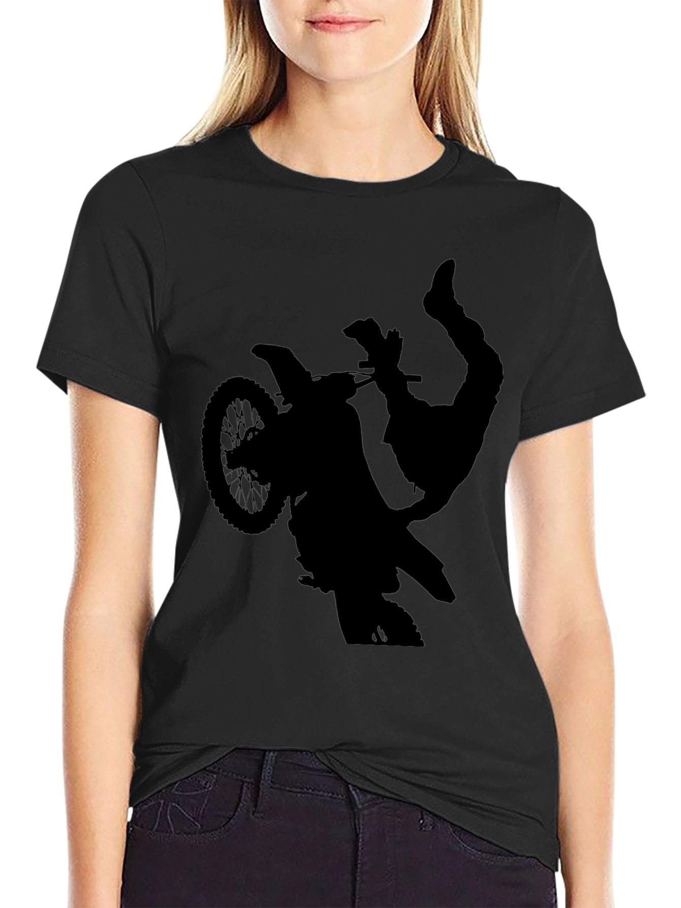 Show off your love for extreme sports with this bold black t-shirt. This tee features a striking silhouette of a motocross rider performing a daring stunt, perfect for enthusiasts and thrill-seekers. The classic black color makes it a versatile addition to your wardrobe, easily paired with jeans or shorts for a casual, edgy look. Made from comfortable, breathable fabric, this shirt is ideal for everyday wear or hitting the track. Grab yours now and let your passion for motocross shine!