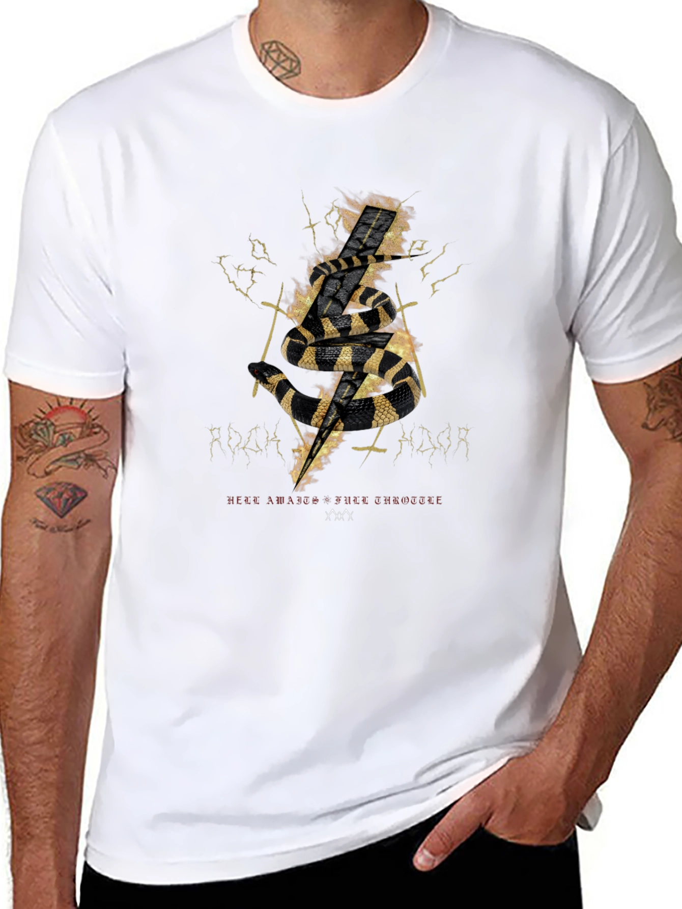 Strike with style in this striking black t-shirt. It features a captivating graphic design of a coiled black and gold snake wrapped around a lightning bolt, creating a powerful and edgy aesthetic. The design is surrounded by stylized crosses and lightning bolts, adding to the intense and gothic vibe. Made from soft, breathable fabric, this tee is perfect for expressing your unique style. Whether you're heading to a concert, hanging out with friends, or simply want to make a bold statement, this t-shirt is an excellent choice.