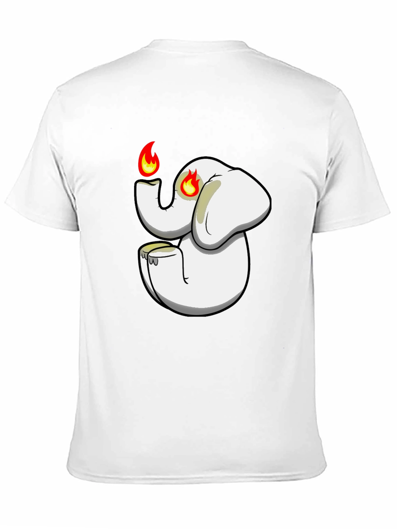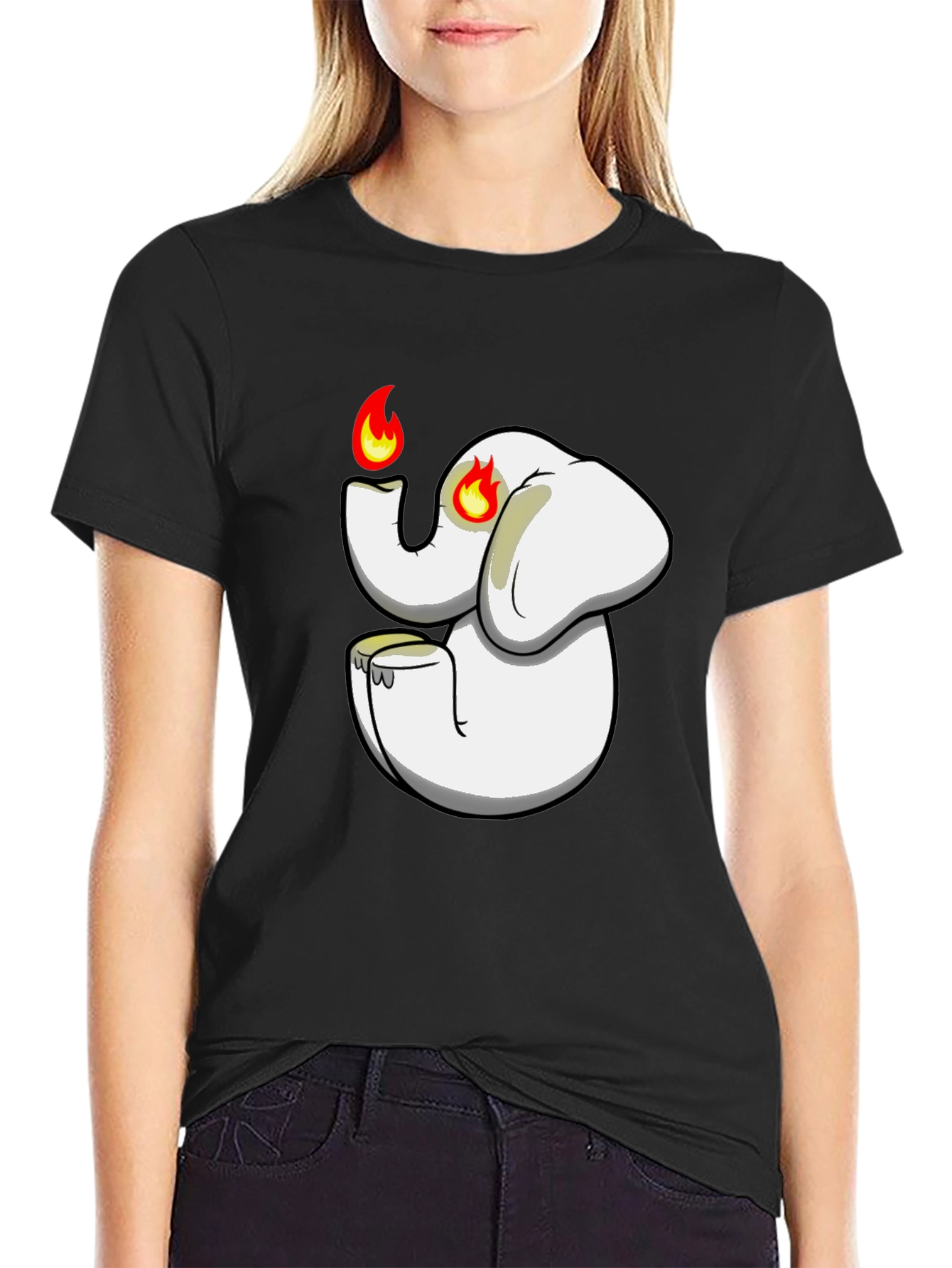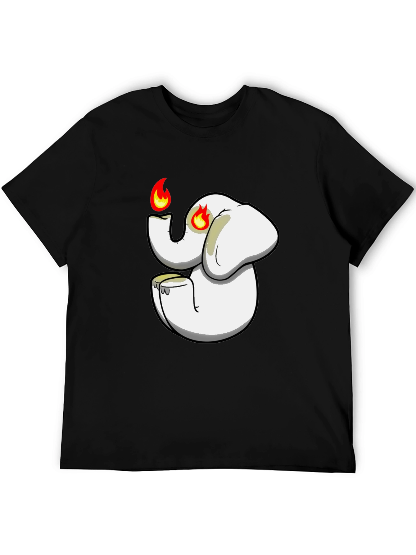 This eye-catching black t-shirt features a playful cartoon graphic of a white elephant. The elephant has fiery details, adding a unique and edgy twist to the design. Made from comfortable material, this short-sleeve tee is perfect for casual wear. Show off your unique style with this fun and trendy shirt. Ideal for everyday wear, casual outings, or as a conversation starter. This unique t-shirt will definitely turn heads!