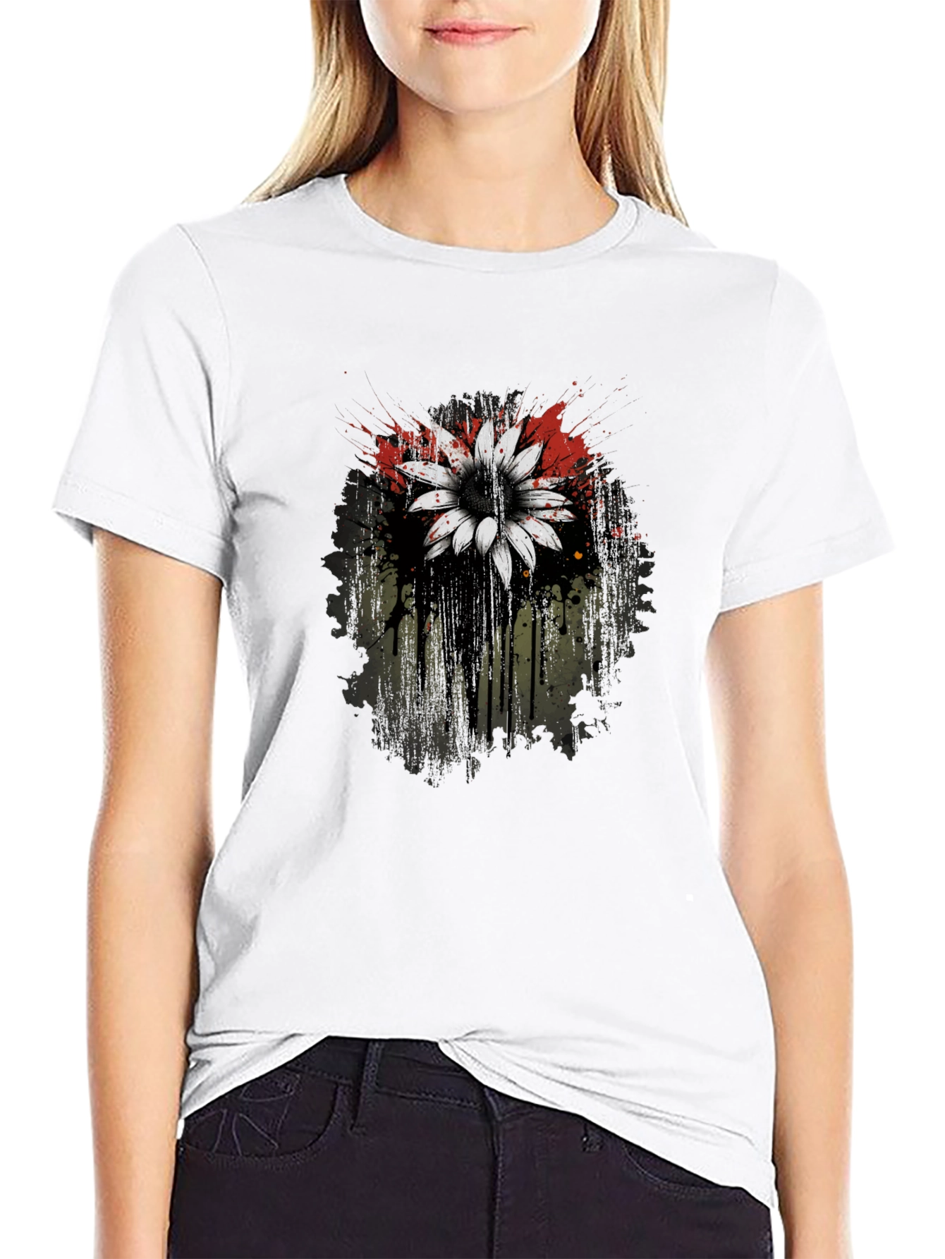 Show off your unique style with this eye-catching black t-shirt. The shirt features a striking graphic print of a white flower with a dark center, set against a grunge-style background of red and green splatters. This design creates a modern and edgy look, perfect for casual wear. Made from a comfortable fabric, this shirt is ideal for everyday use. Pair it with jeans or shorts for a relaxed yet fashionable outfit. The vibrant design is sure to make a statement wherever you go, adding a touch of personality to your wardrobe.