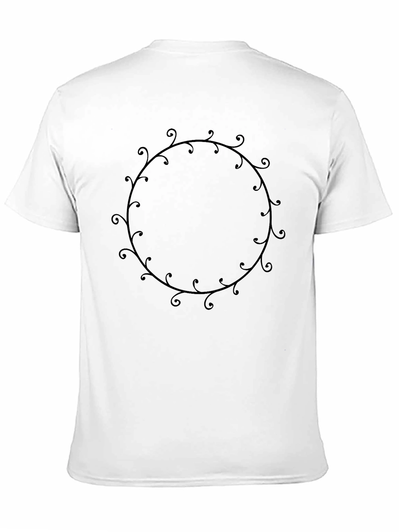 This classic black t-shirt features a unique ornamental circle design on the front, adding a touch of sophistication to a casual wardrobe staple. The shirt appears to be made from a comfortable, breathable fabric, perfect for everyday wear. The ornamental circle design is composed of vine-like tendrils that curve to create a floral aesthetic. Its dark color creates a sleek and modern look that's easy to style. This t-shirt is ideal for anyone who appreciates minimalist style with a hint of visual interest. Dress it up with a blazer or keep it casual with jeans or shorts. A versatile addition to any wardrobe!