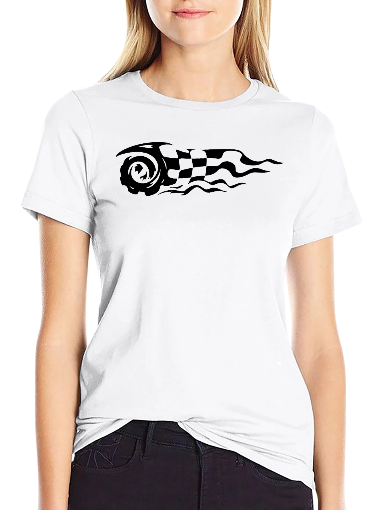 This classic black t-shirt features a bold, stylized graphic of a racing flag. The striking design combines the checkered flag motif with dynamic swirling elements, giving it a modern and edgy look. Made from what appears to be a soft, comfortable cotton blend, this tee is perfect for everyday wear. Its versatile style makes it suitable for casual outings, sporting events, or simply relaxing at home. The sleek black color ensures it pairs effortlessly with jeans, shorts, or layered under a jacket. Show off your love for racing and motorsports with this eye-catching tee.