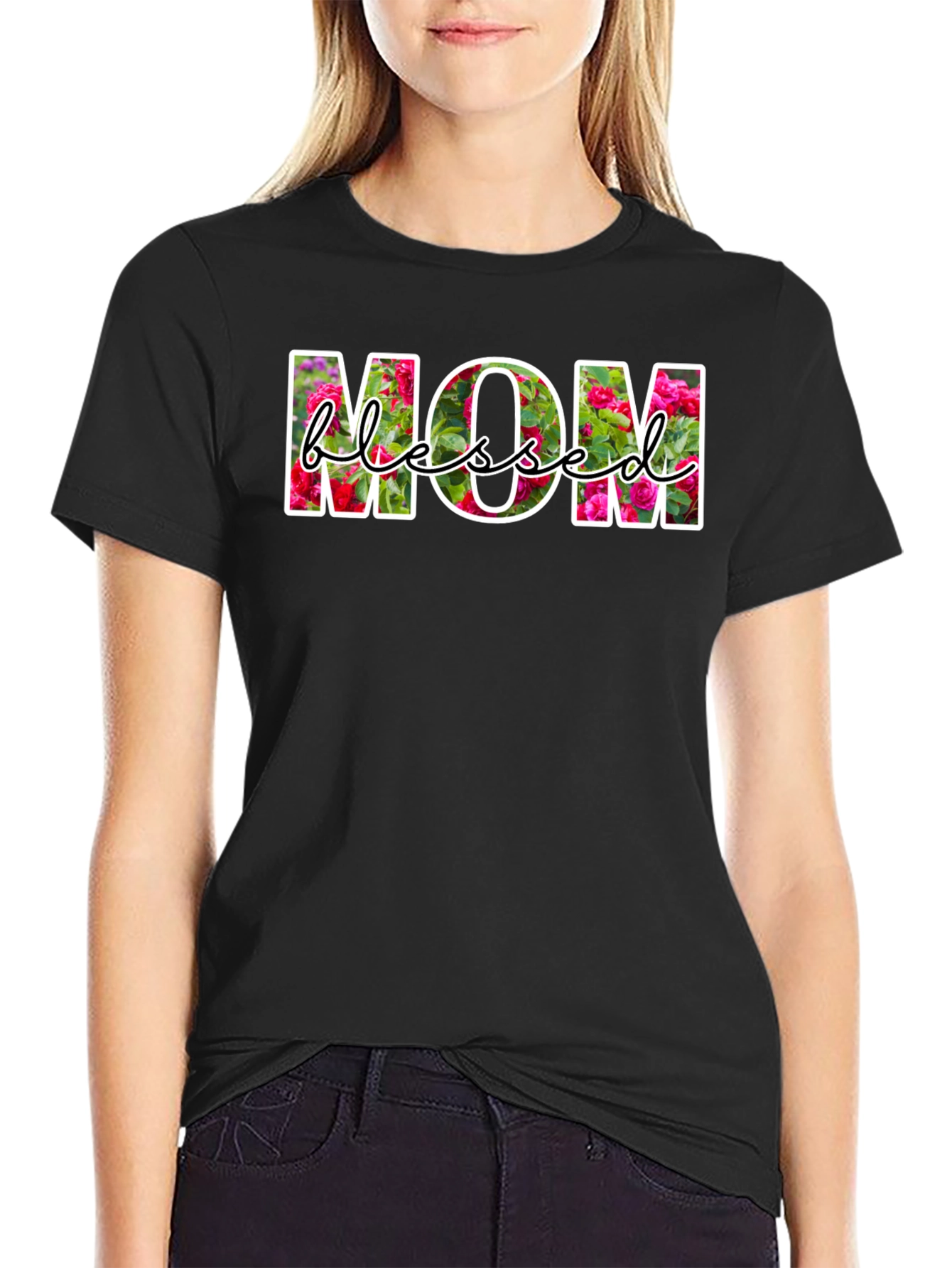 Celebrate Mom with this stylish black graphic t-shirt. The design features the word "MOM" filled with a beautiful floral pattern of red and green hues, overlaid with the word "Blessed" in an elegant script. Made from a comfortable fabric, this shirt is perfect for everyday wear. Show your love and appreciation with this unique and eye-catching design. Ideal for Mother's Day, birthdays, or just to show Mom how much you care! This tee makes a thoughtful gift.