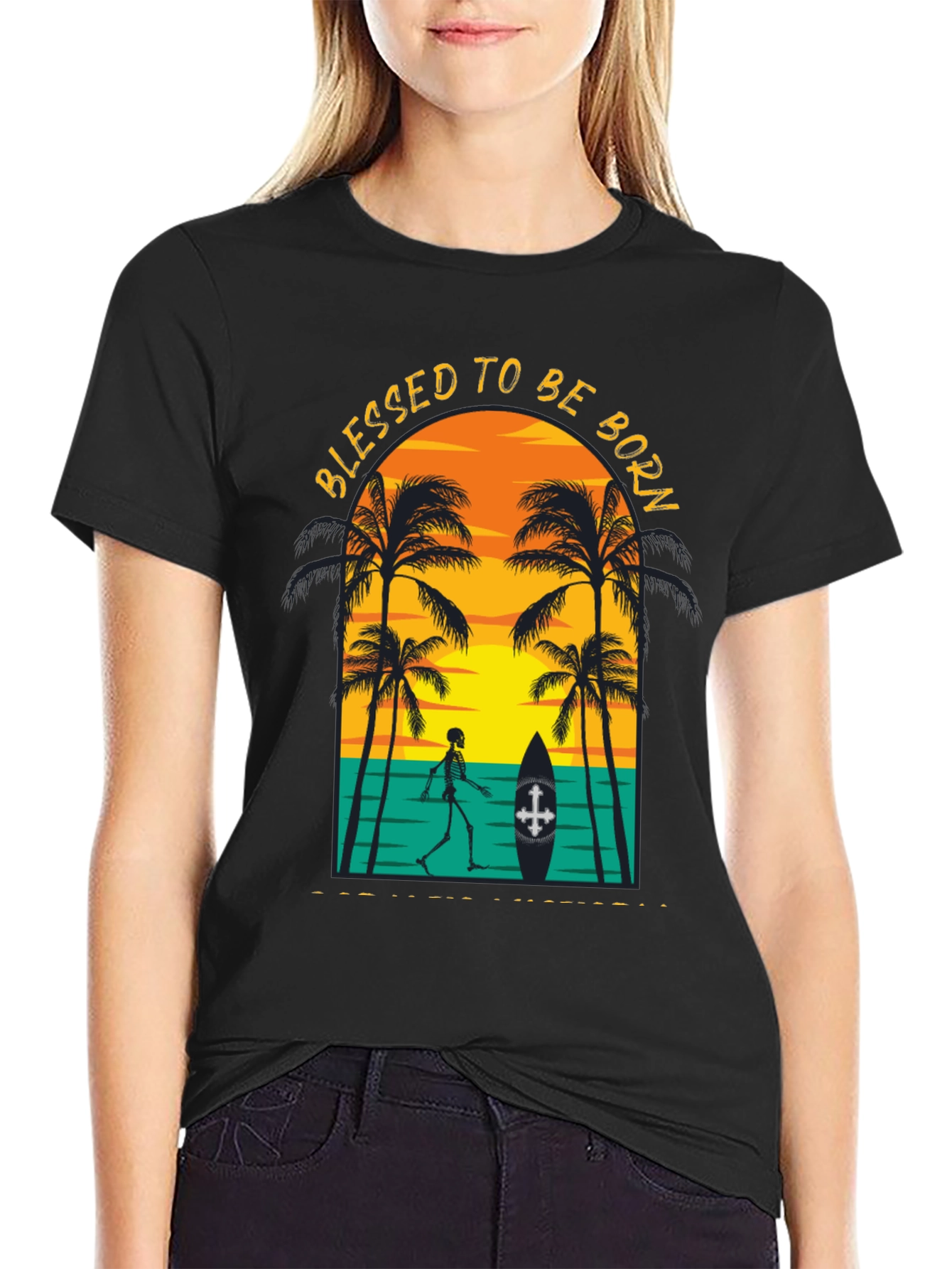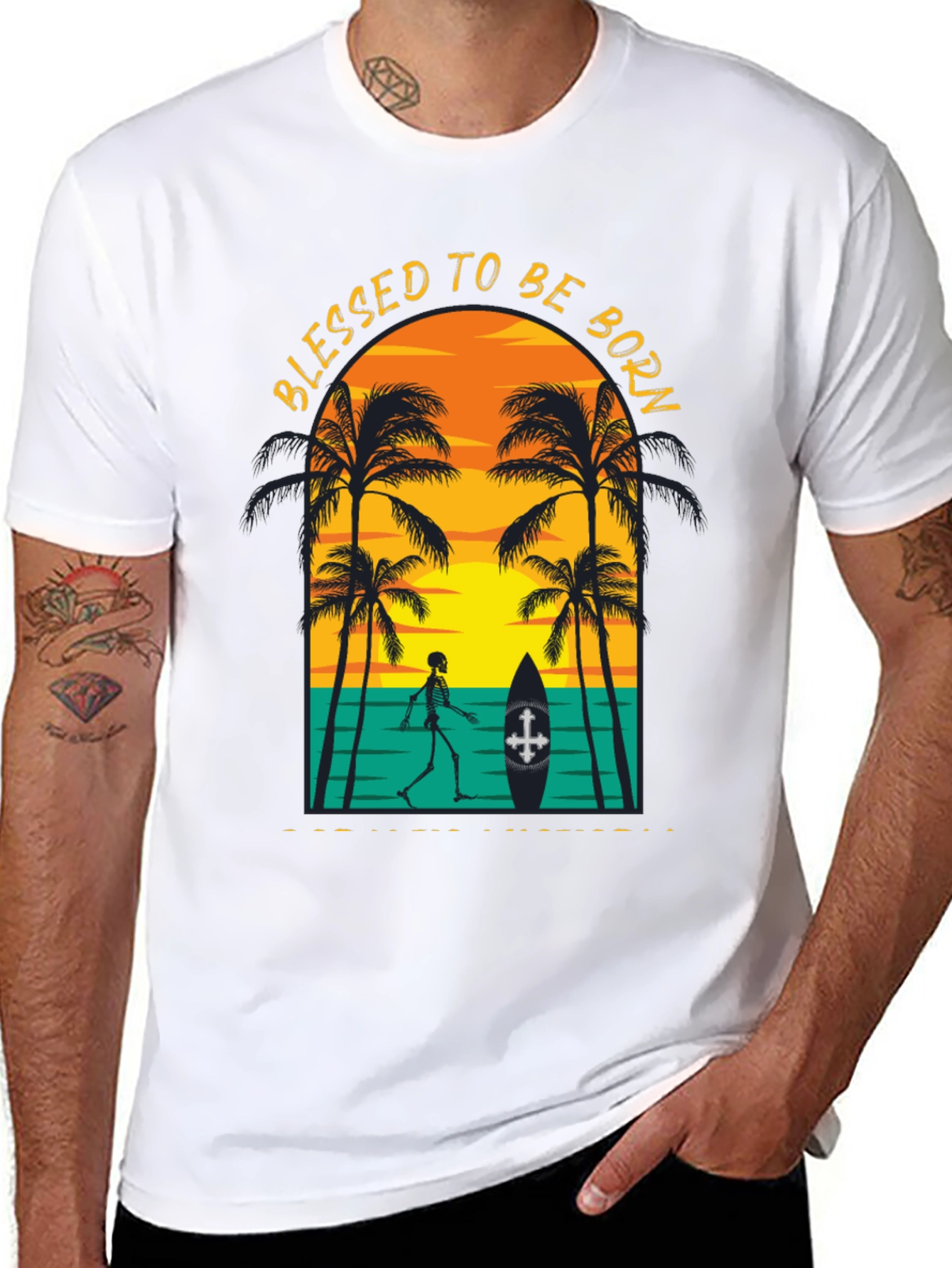 Embrace a unique style with this eye-catching graphic tee. Featuring a vibrant beach scene with palm trees, a stunning sunset, and a skeleton casually strolling by a surfboard, this tee is a statement piece. The words "Blessed to Be Born" arc across the top, adding a touch of inspiration. Made from a comfortable, breathable fabric, this t-shirt is perfect for everyday wear, casual outings, or making a statement at your next beach trip. Its bold design and comfortable fit make it a must-have for those who love quirky and stylish apparel. Stand out from the crowd and express your individuality with this distinctive tee.