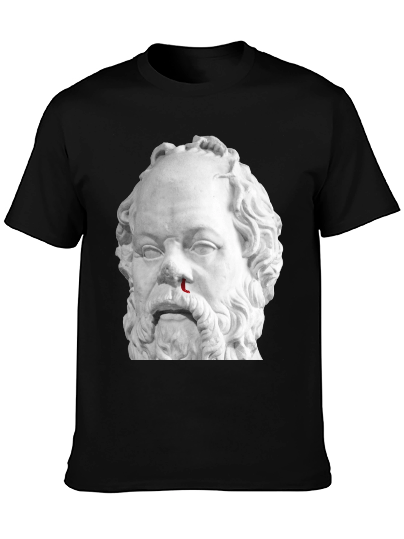 Make a statement with this unique black t-shirt featuring a striking graphic print of the iconic Socrates statue with a humorous, bloody nose detail. Crafted from comfortable, soft fabric, this tee offers a relaxed fit perfect for everyday wear. The high-quality print ensures long-lasting vibrancy, making it a standout piece in your wardrobe. Ideal for casual outings, philosophical discussions, or as a conversation starter. Show off your intellectual wit and edgy style with this eye-catching Socrates tee. It's sure to make a bold impression and express your unique personality. Grab yours today and add a touch of humor to your everyday attire!