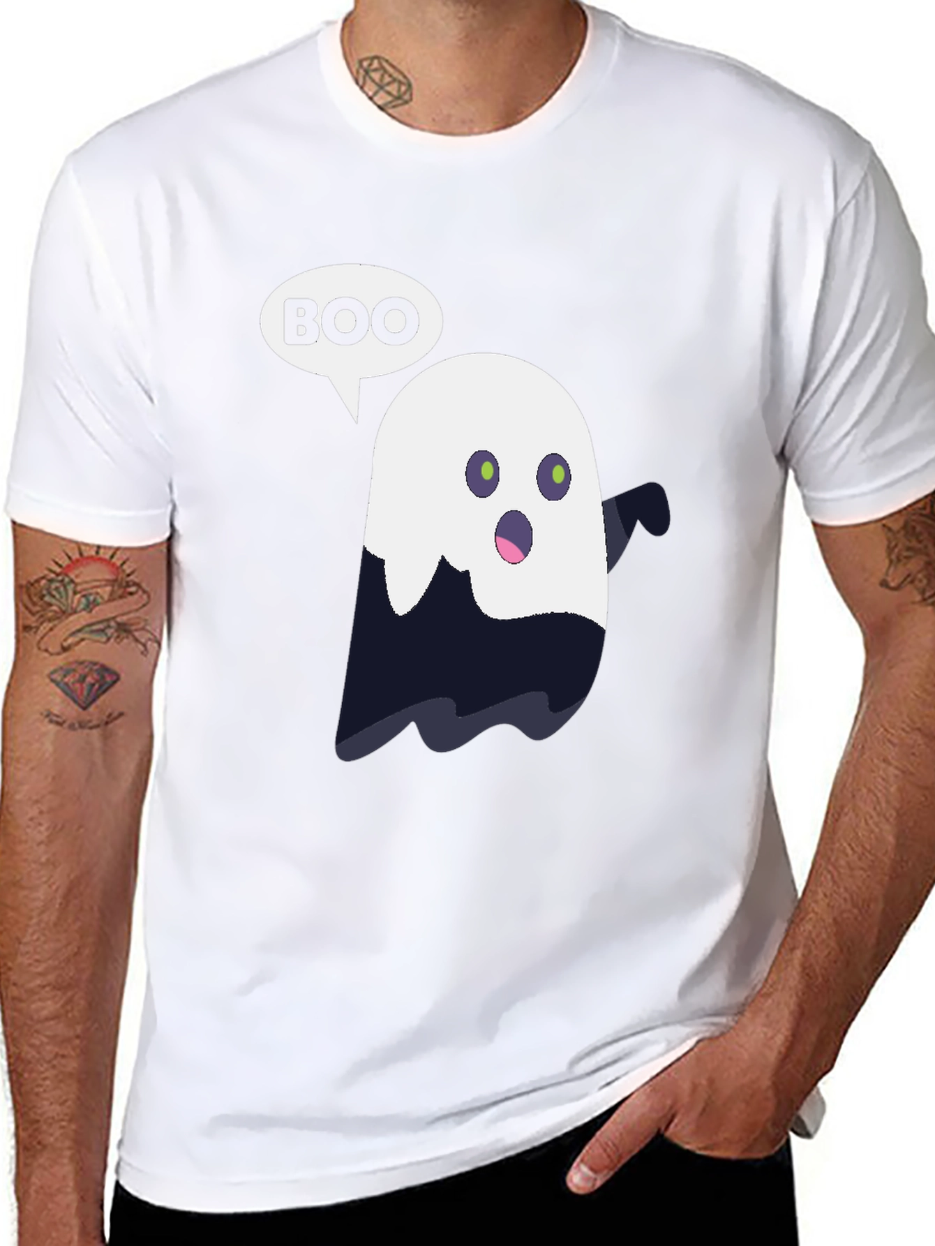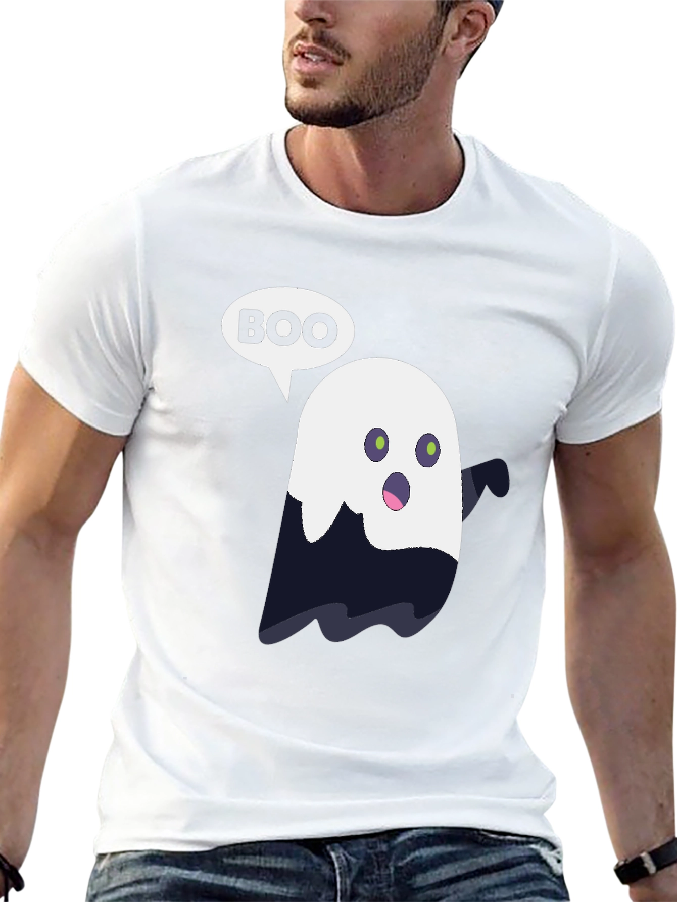 Get ready for Halloween with this fun and spooky graphic t-shirt! Made from comfortable, soft fabric, this tee features a cute ghost design with a speech bubble that says "BOO". The ghost is a combination of white and darker shade, giving it a playful yet spooky appearance. Perfect for Halloween parties, trick-or-treating, or just showing off your love for the spooky season. This t-shirt is a must-have for anyone who loves Halloween and wants to add a touch of fun to their wardrobe. Easy to wear and care for, it's sure to become a favorite in your collection. A great gift idea for Halloween enthusiasts!